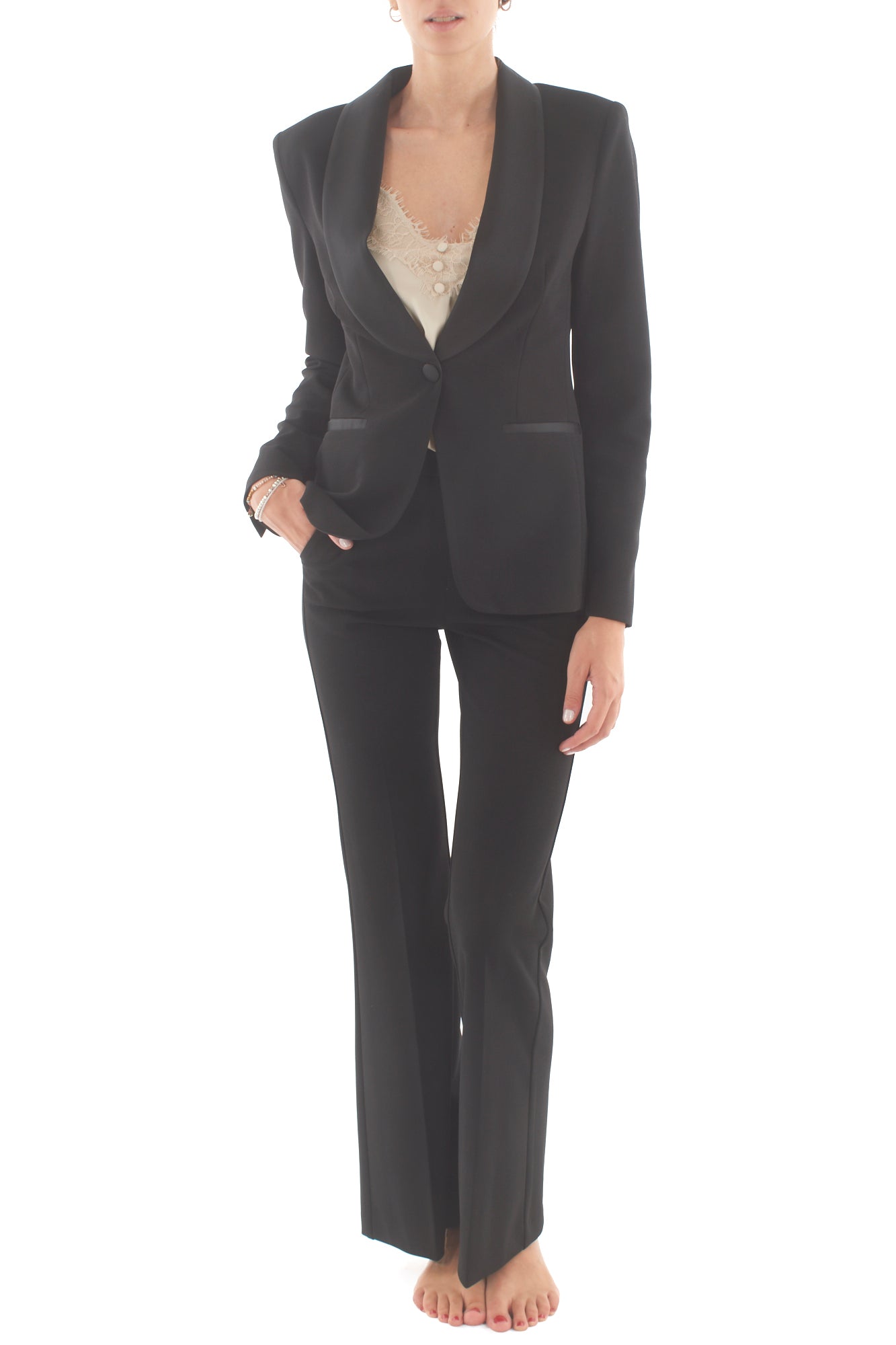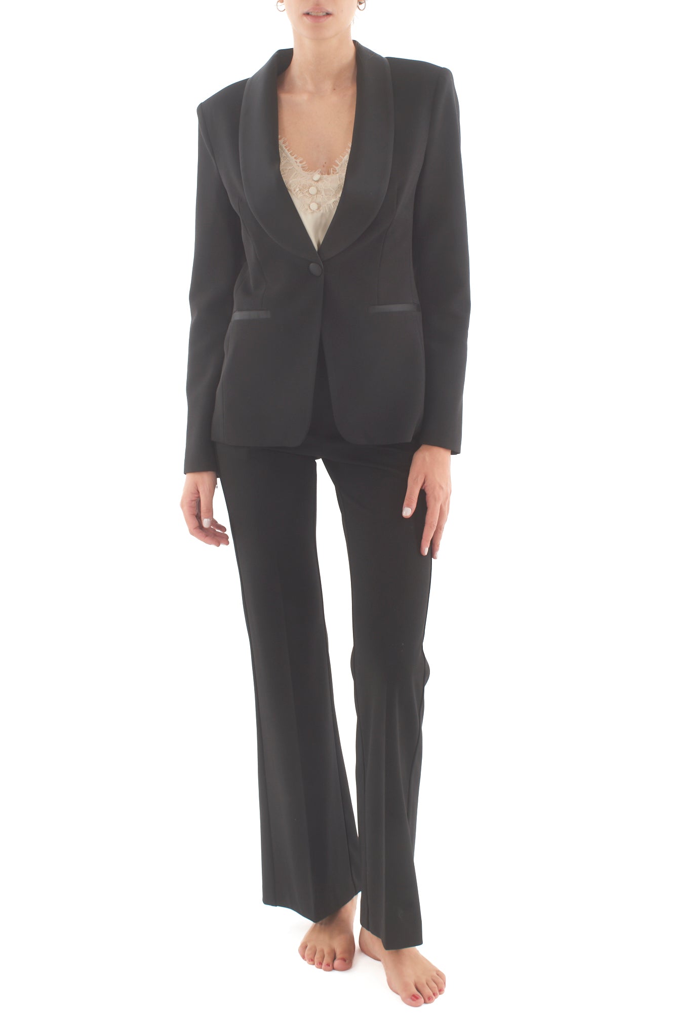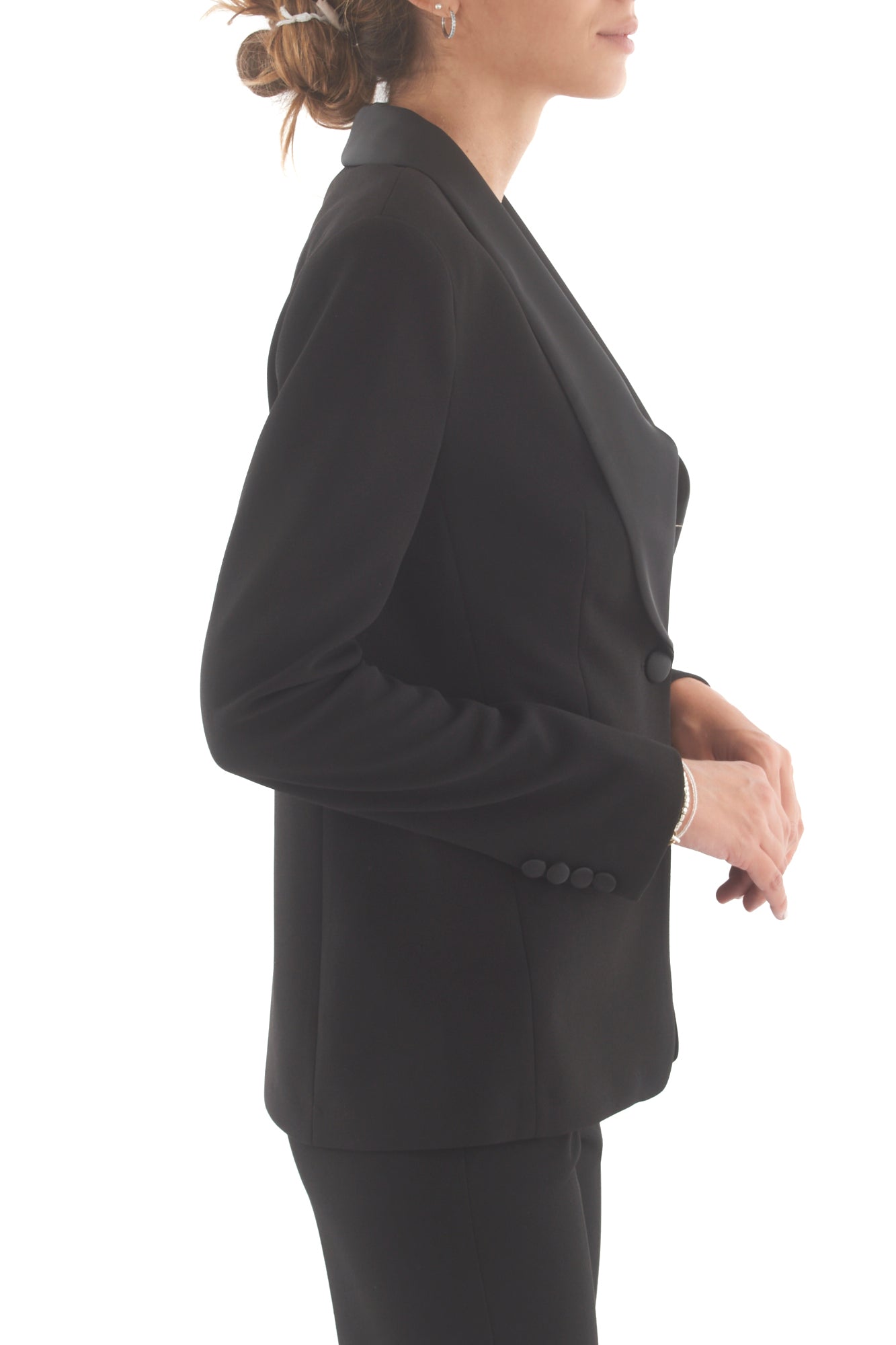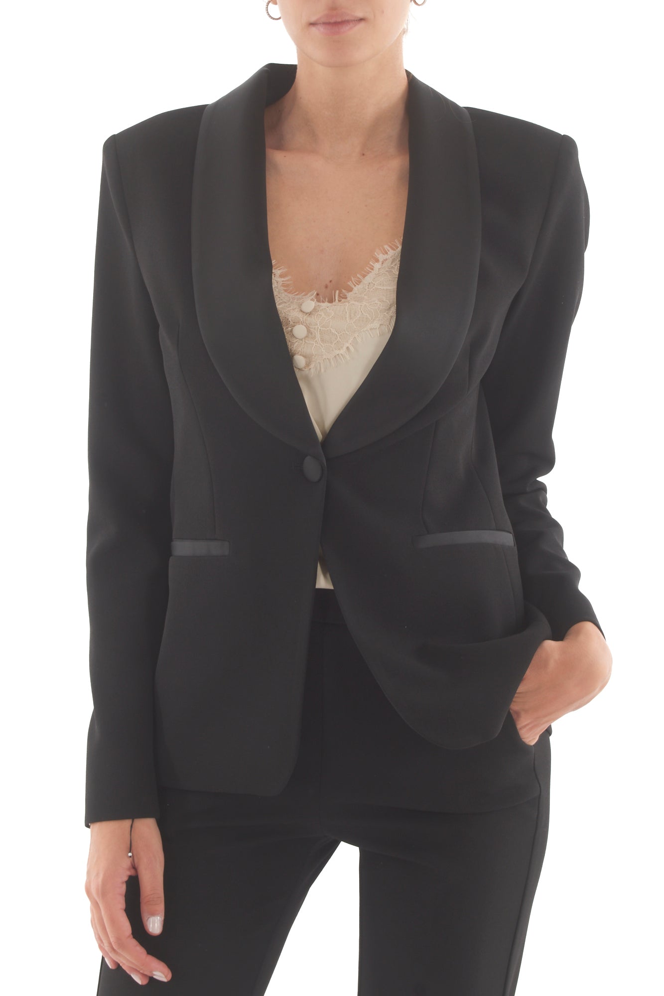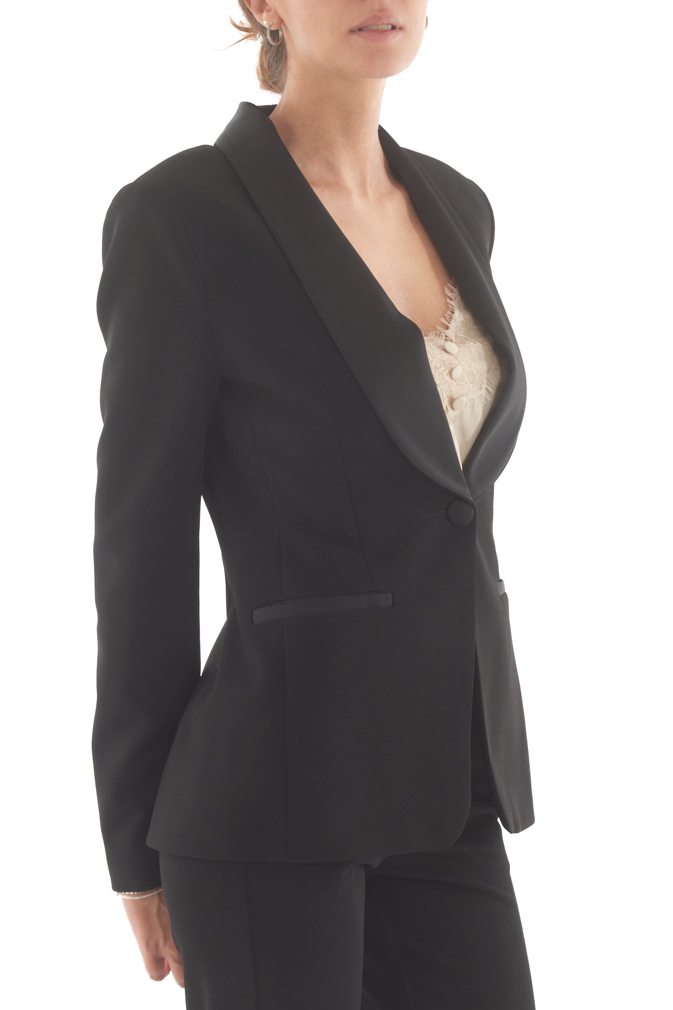 Elegante giacca tipo smoking con raffinati profili in raso, ideale per aggiungere un tocco di classe ad ogni occasione formale. Taglio sartoriale, tessuto di alta qualità e dettagli curati rendono questo capo un must-have per un look sofisticato e ricercato