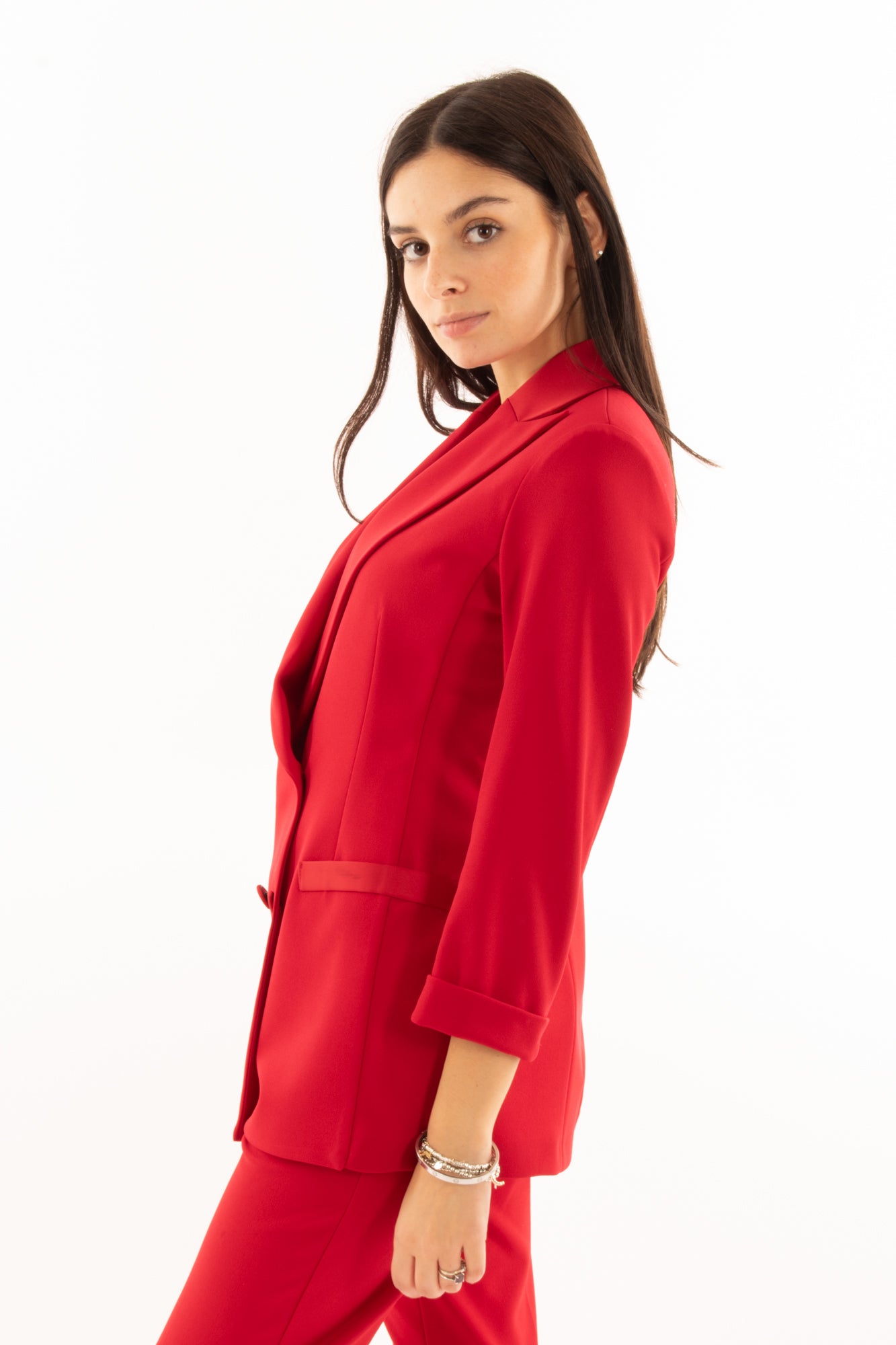 Giacca doppio petto con manica 3/4 con profili raso, veste regolare.