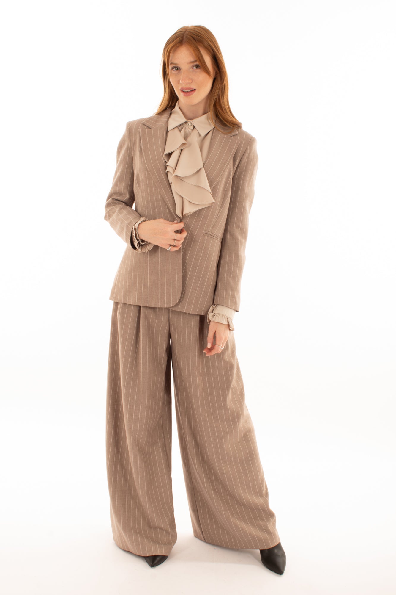 La Giacca è un capo must have di tutti i guardaroba. Realizzata in tessuto gessato di qualità superiore, con un unico bottone di chiusura e uno spacchetto centrale, è perfetta da indossare sia durante il giorno sia la sera.