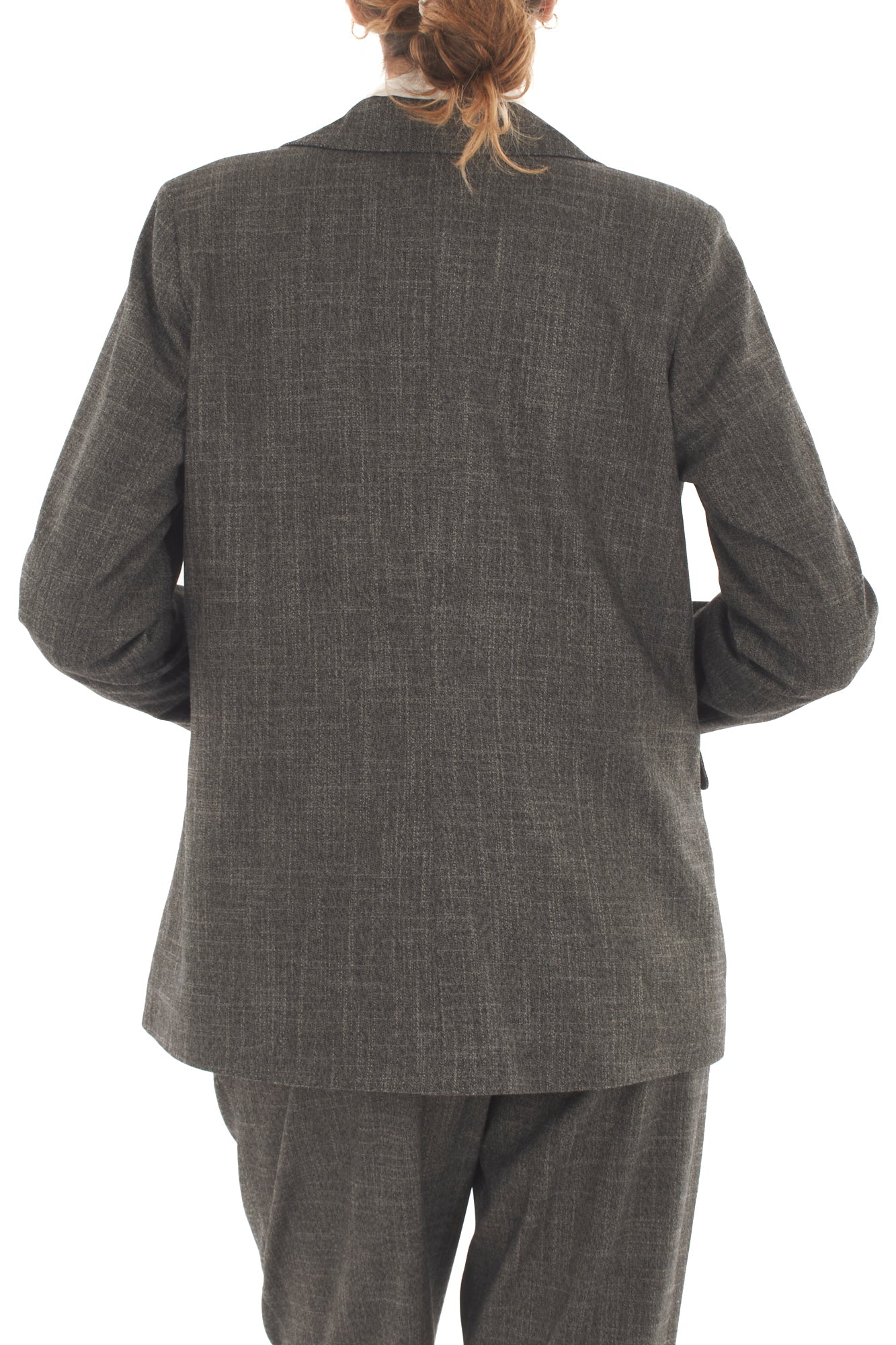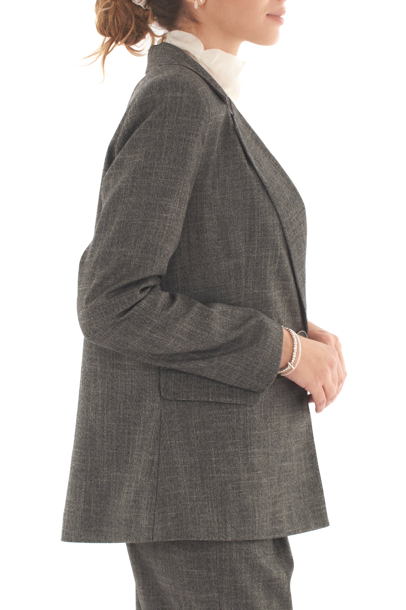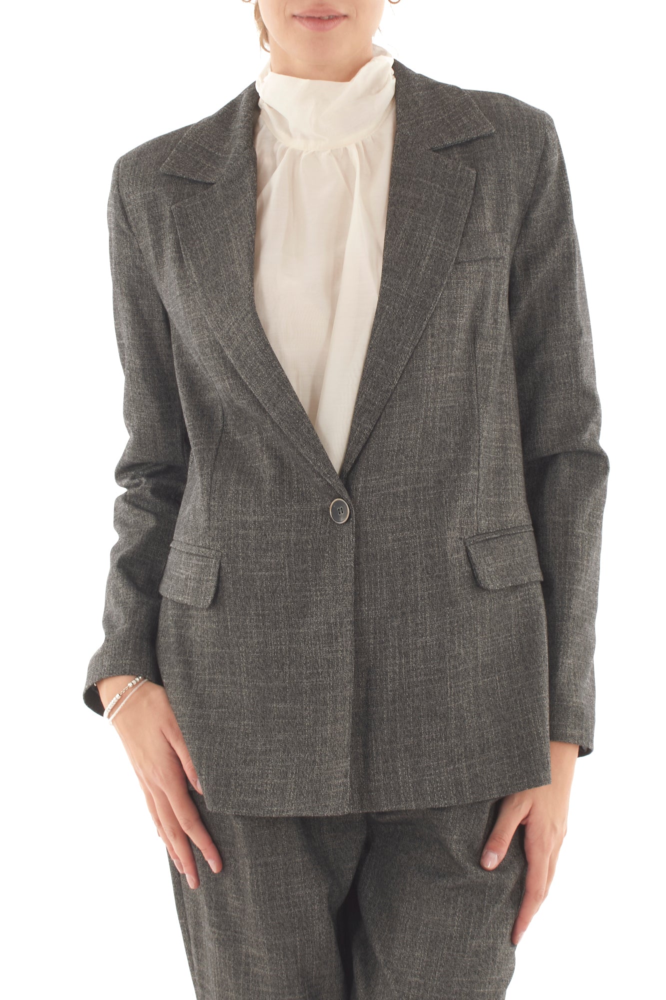 Giacca morbida in elegante tessuto di grisaglia, caratterizzata da un design minimalista con chiusura a un bottone. Perfetta per un look sofisticato e contemporaneo, offre comfort e versatilità grazie al suo taglio essenziale e alla leggerezza del tessuto.