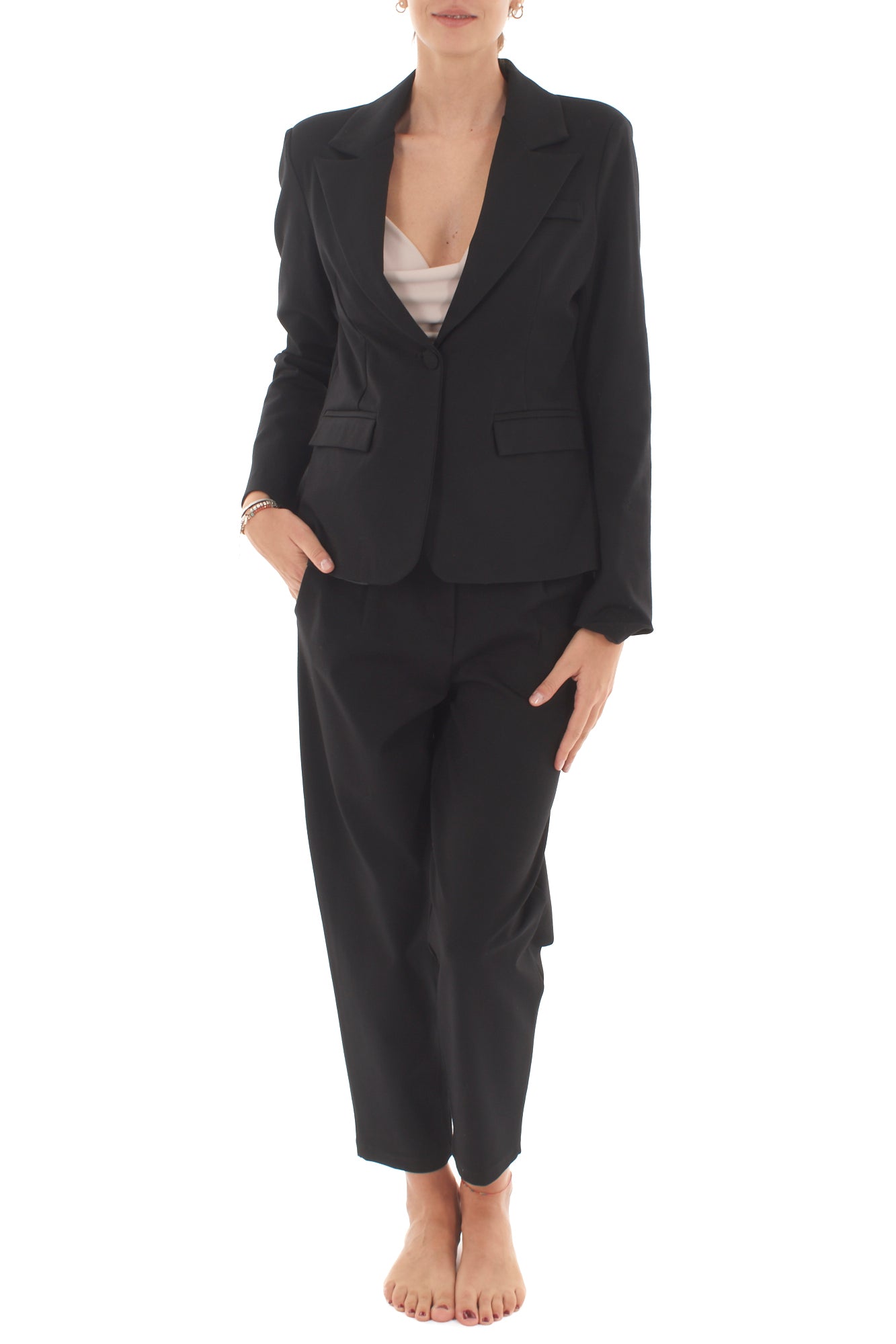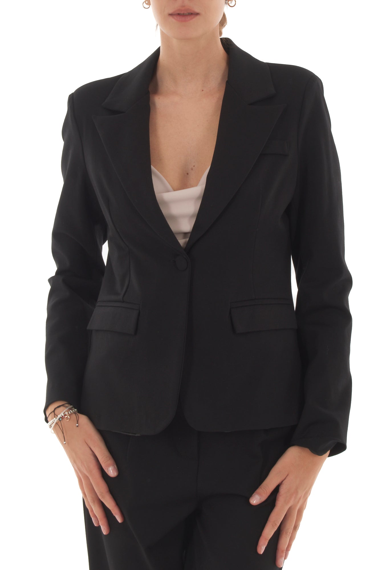 Giacca sfiancata monopetto elegante e versatile, perfetta per valorizzare la silhouette femminile. Realizzata con materiali di alta qualità, offre comfort e stile per ogni occasione, dall'ufficio a eventi speciali. Un capo intramontabile che aggiunge un tocco raffinato al tuo look.
