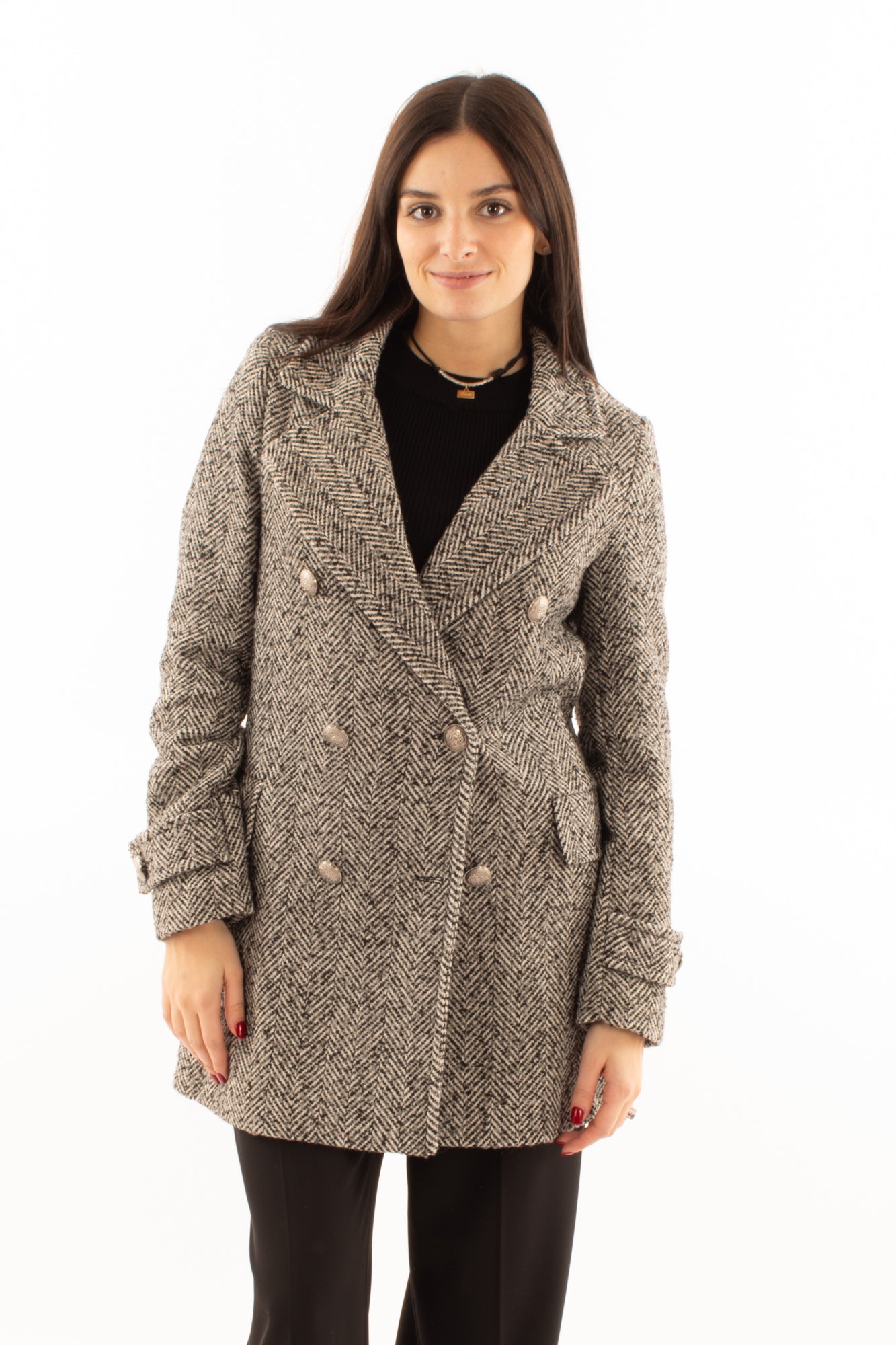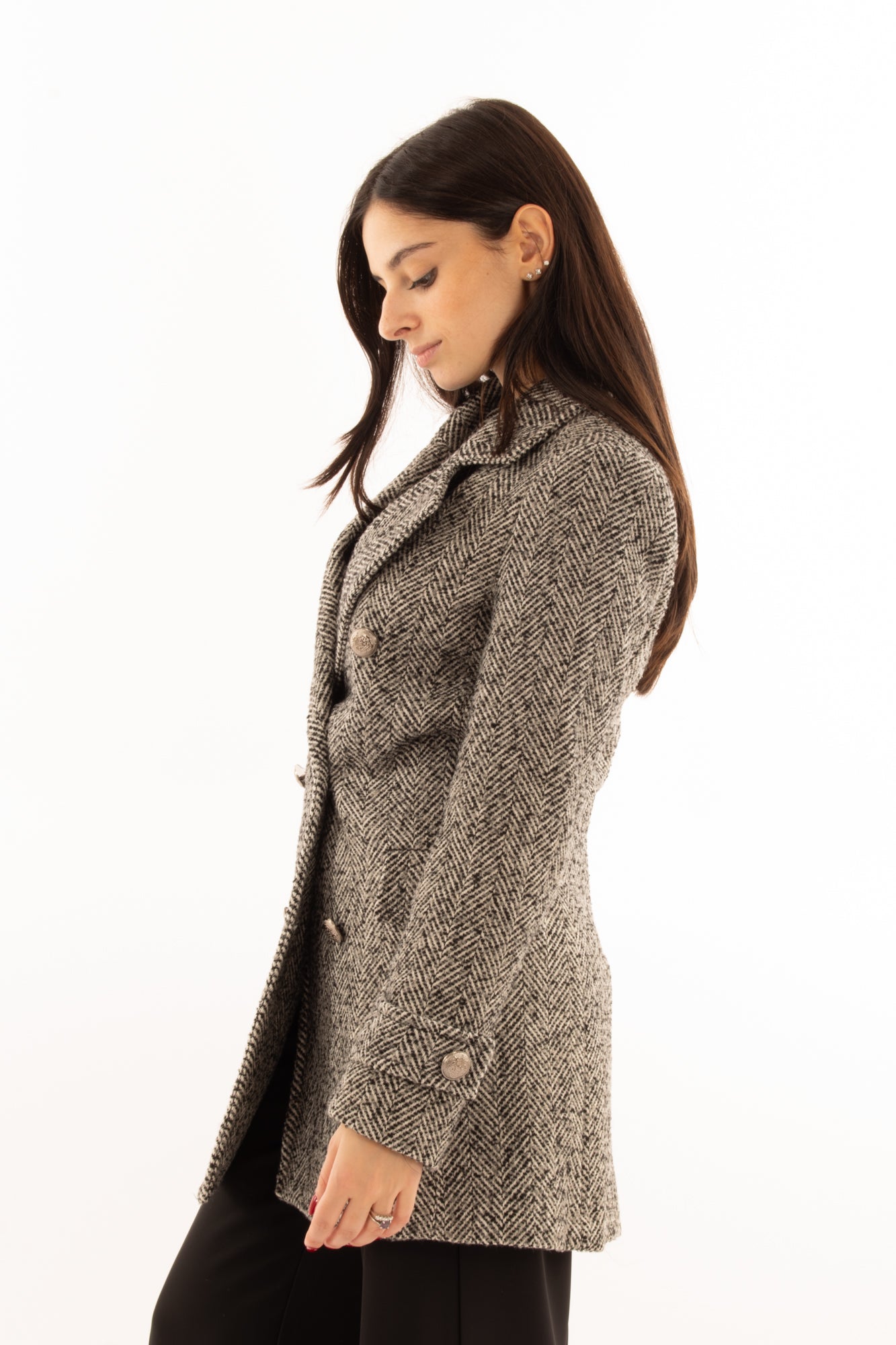 "Esplora l'eleganza senza tempo con il nostro giaccone 3/4 doppio petto spinato. Questo capo offre stile e calore in un design classico, perfetto per le stagioni più fredde. Scopri la moda e il comfort in un'unica soluzione!"