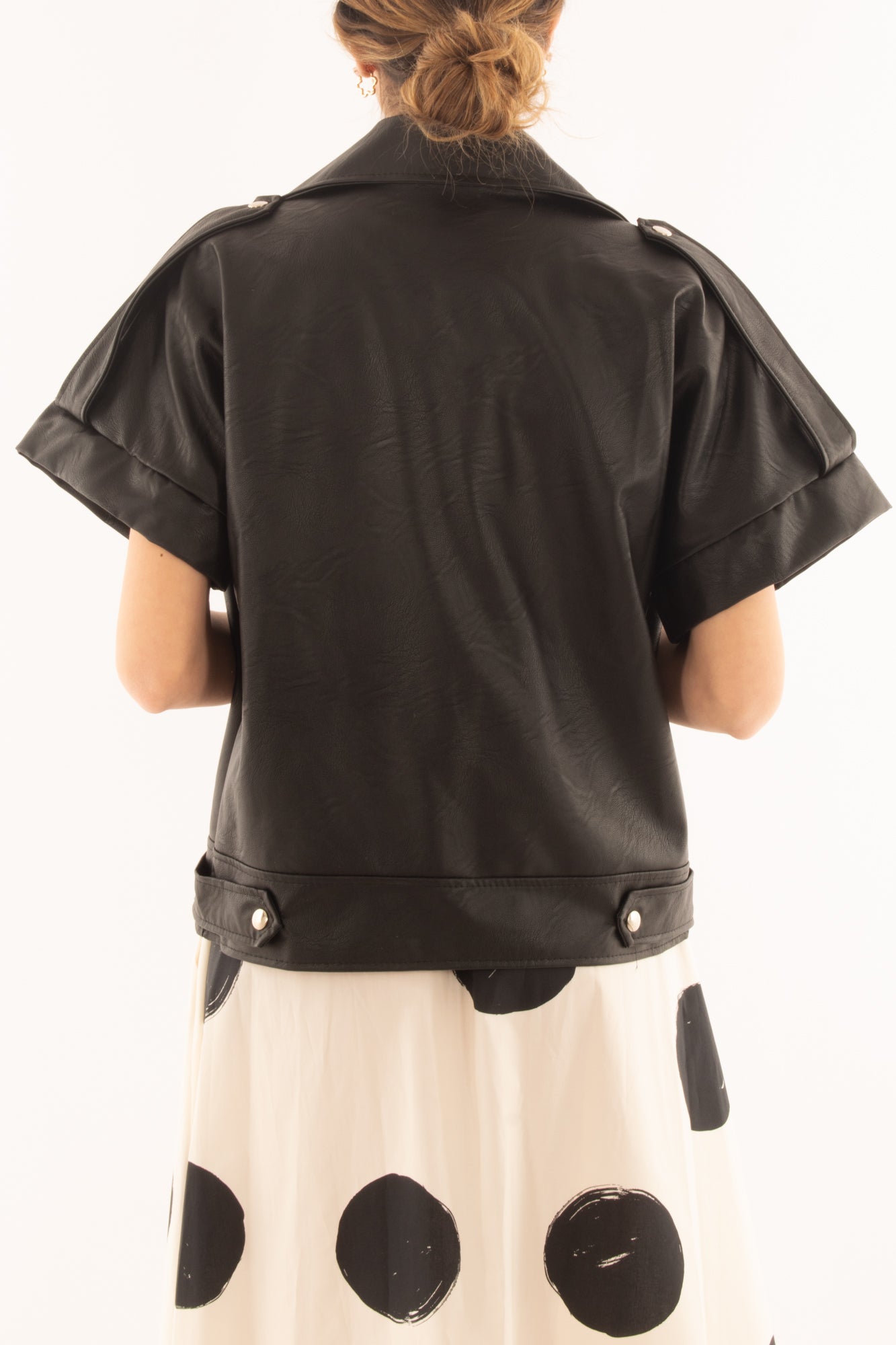 "Esalta il tuo stile con il nostro chiodo in ecopelle dalle maniche corte. Realizzato con materiali di alta qualità, questo capo versatile aggiunge un tocco di modernità al tuo guardaroba. Scopri il perfetto connubio tra comfort e stile senza rinunciare alla sostenibilità."