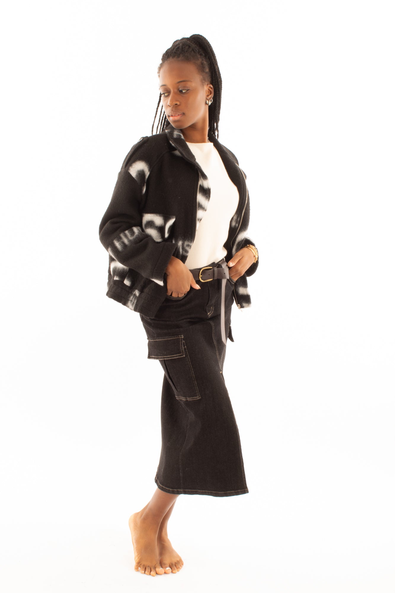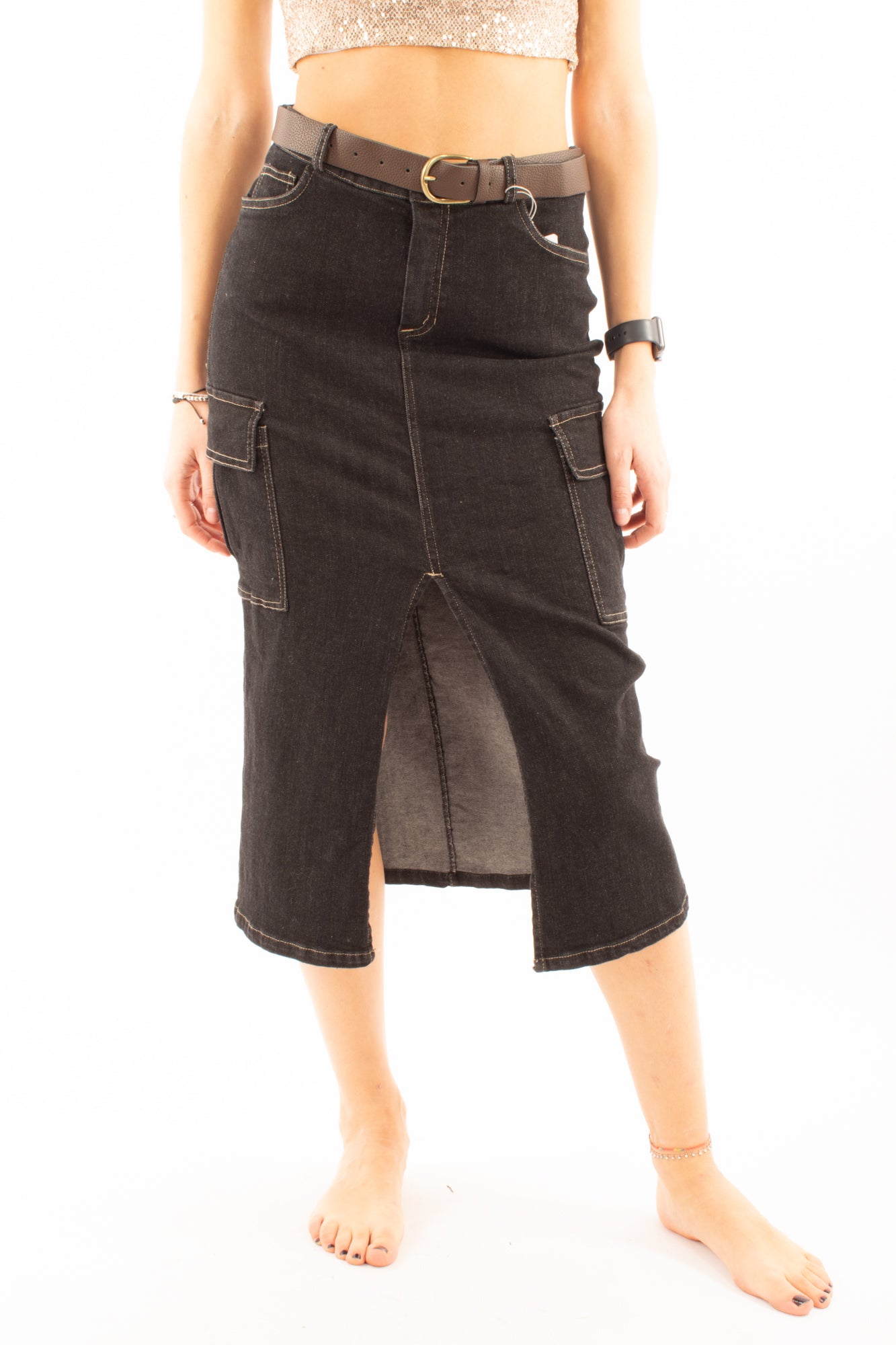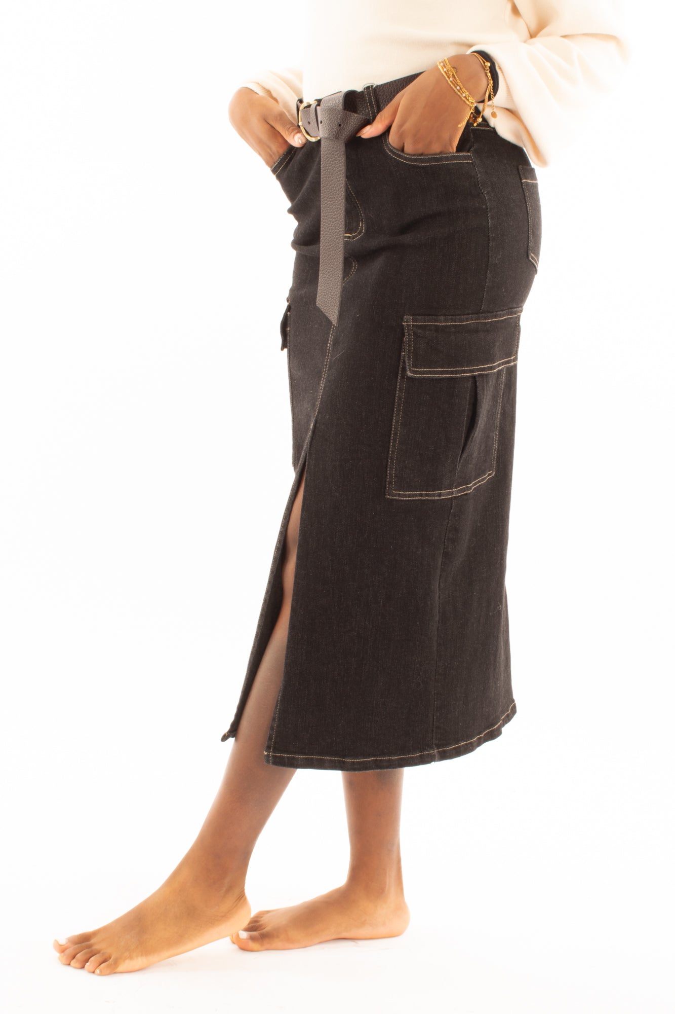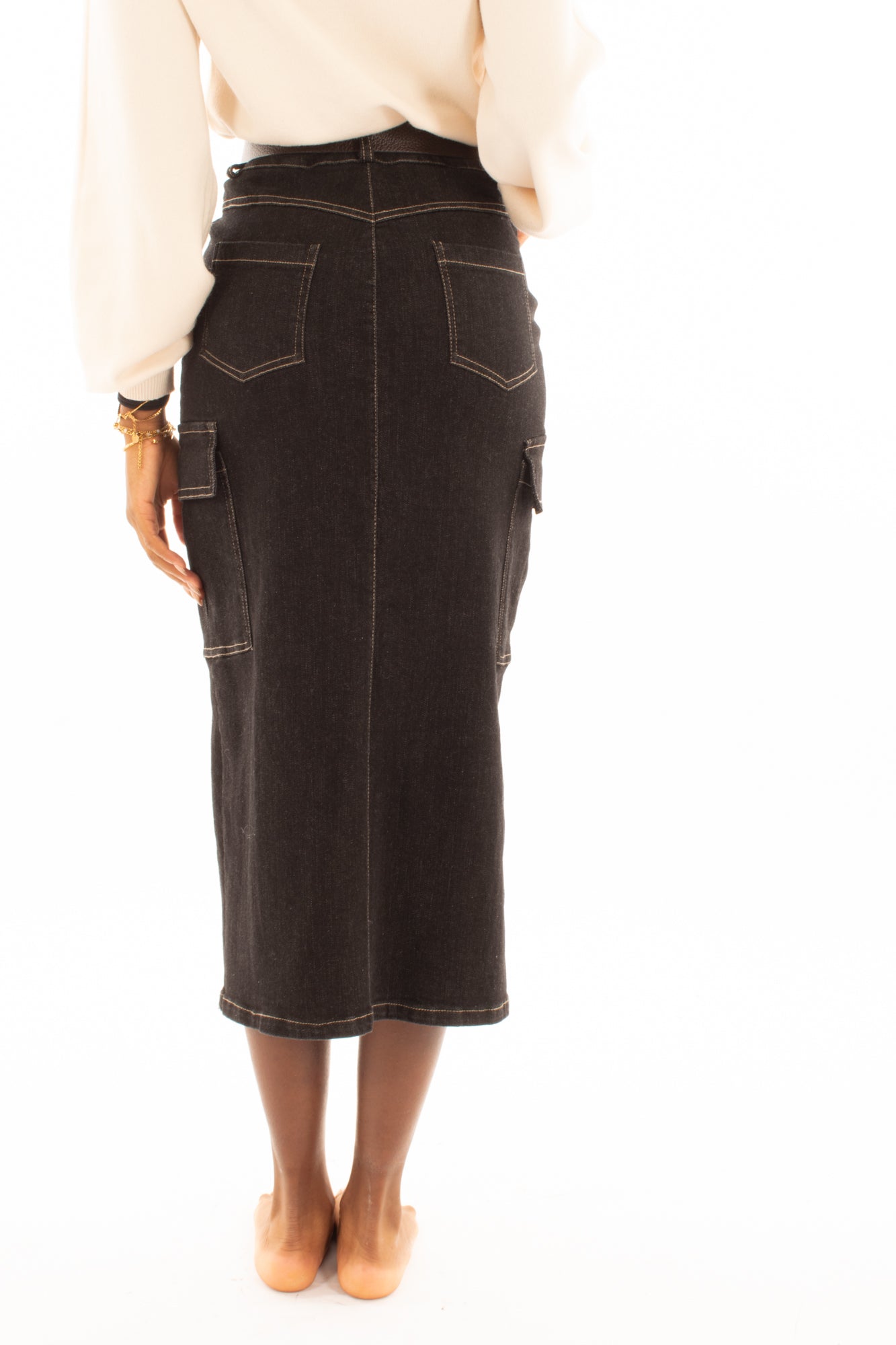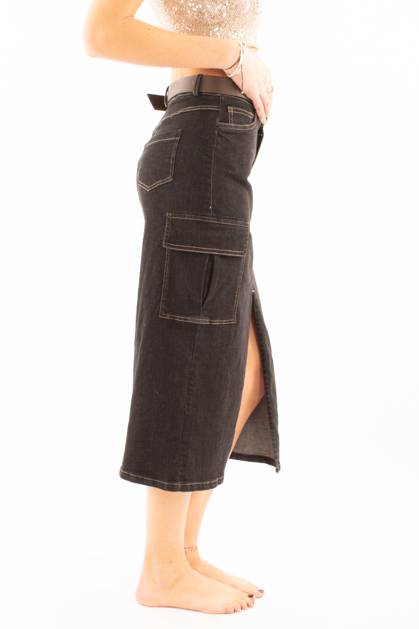 Gonna 3/4 di jeans nera con tasconi: L'abbigliamento femminile perfetto per uno stile casual e pratico. La gonna di lunghezza media offre comfort, mentre i tasconi la rendono funzionale e alla moda. Scopri il tuo look versatile oggi!