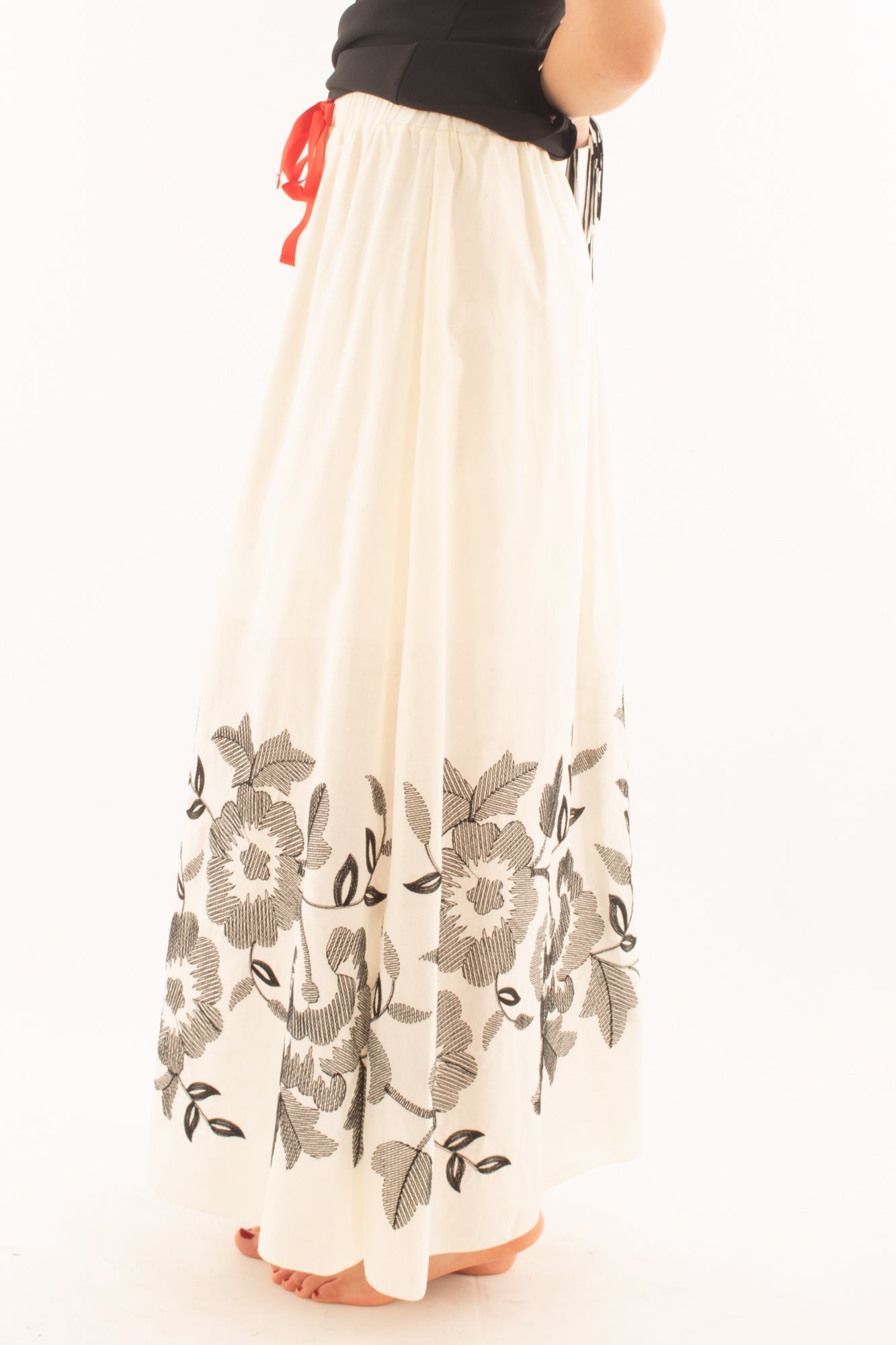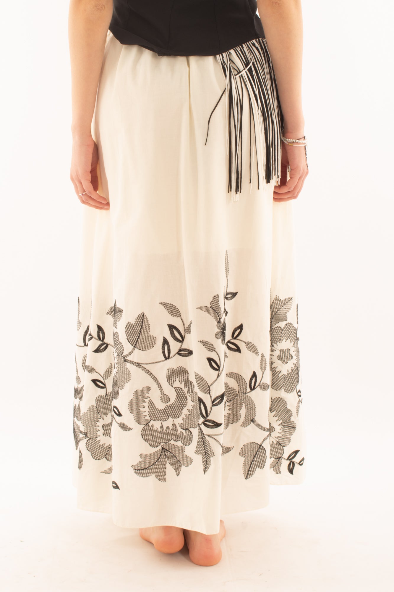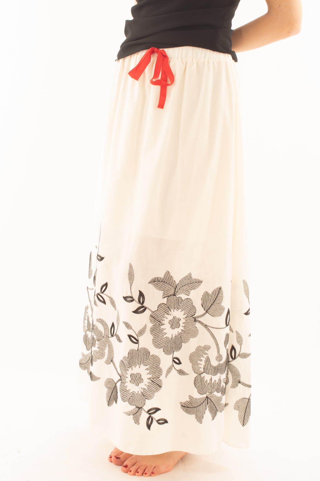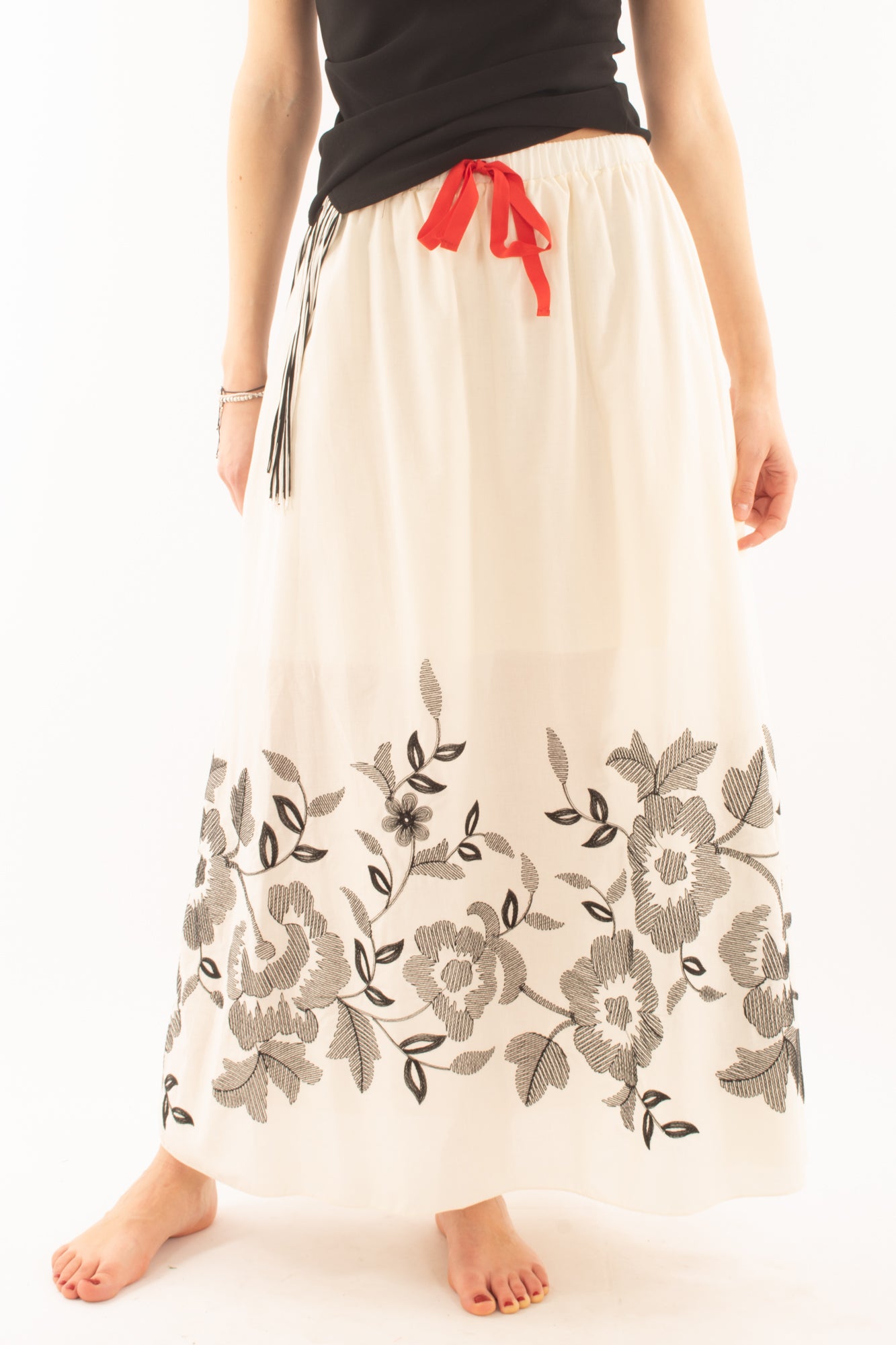 Gonna lunga con ricami a contrasto e laccetto rosso, perfetta per un look elegante e raffinato. Realizzata con materiali di alta qualità, offre comfort e stile. Ideale per occasioni speciali e abbinamenti chic, valorizza la silhouette con un tocco di classe e originalità.