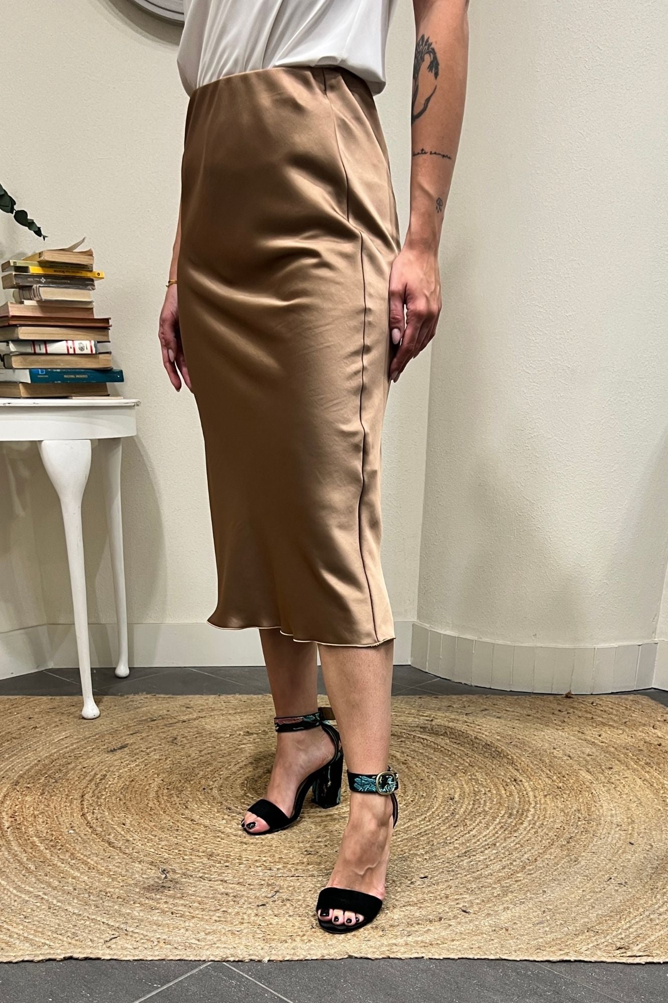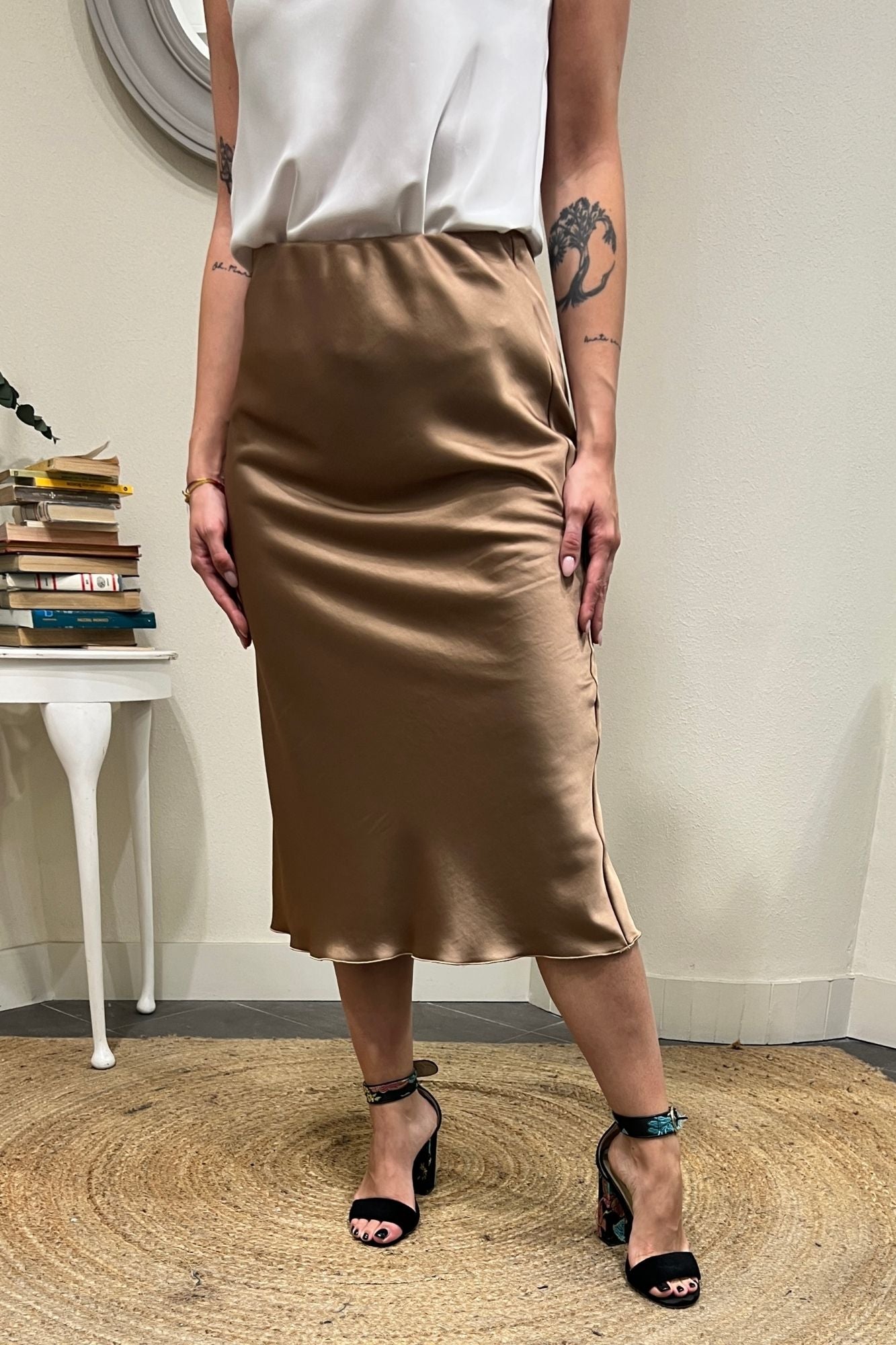 Scegli la raffinatezza della nostra gonna in satin 3/4. Il tessuto fluido e la vestibilità impeccabile la rendono perfetta per un look sofisticato, dal giorno alla sera.