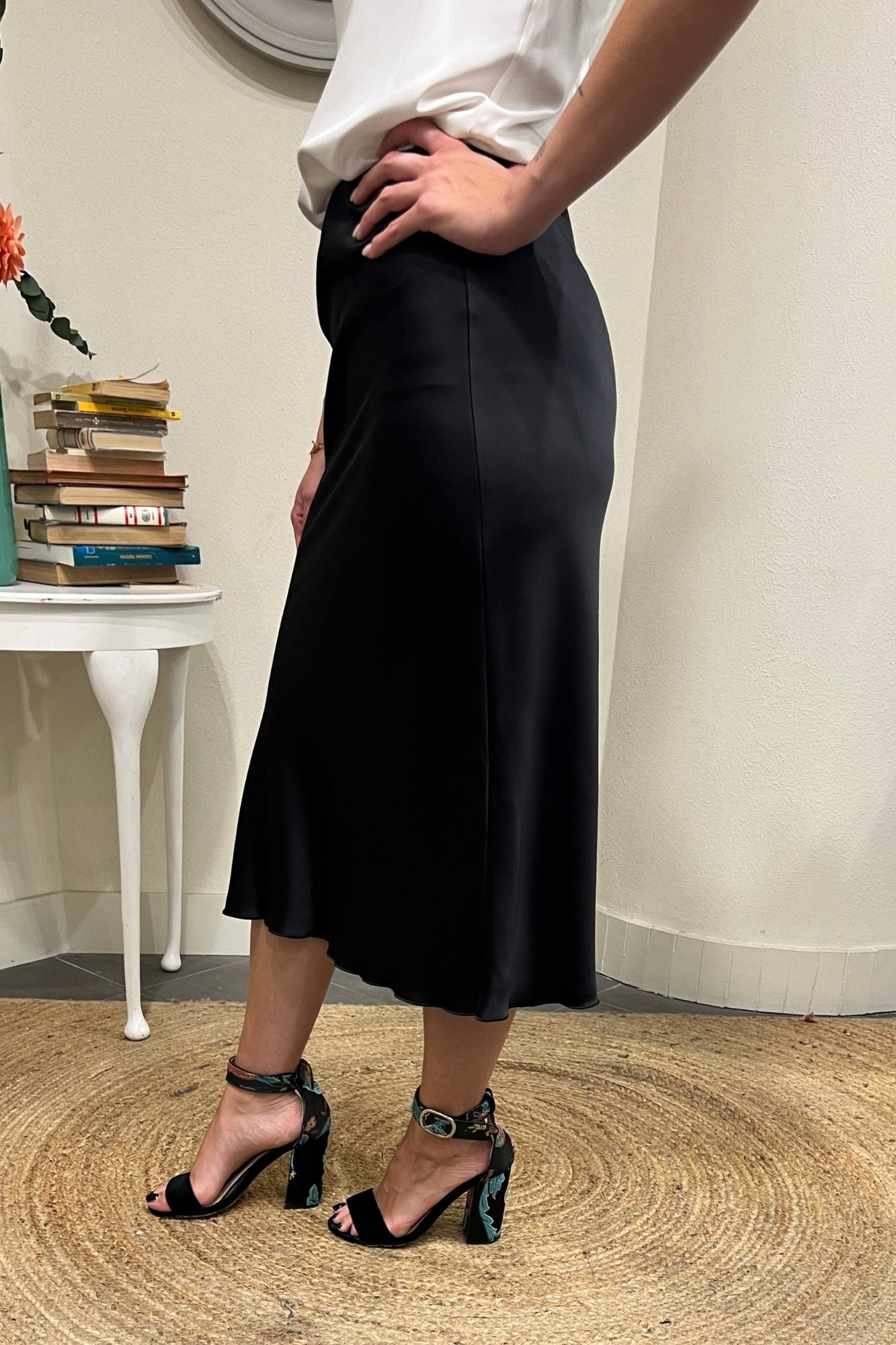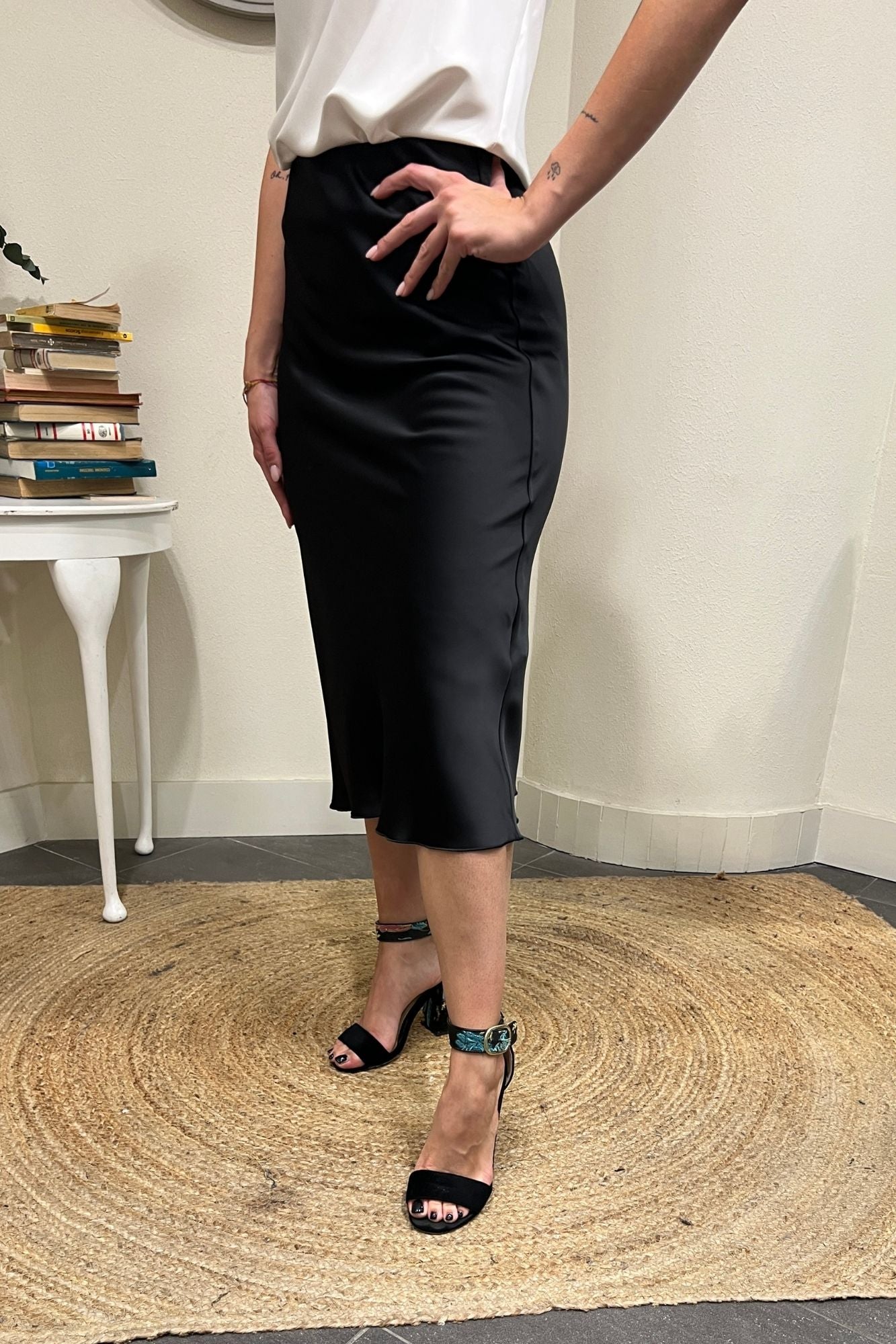 Scegli la raffinatezza della nostra gonna in satin 3/4. Il tessuto fluido e la vestibilità impeccabile la rendono perfetta per un look sofisticato, dal giorno alla sera.