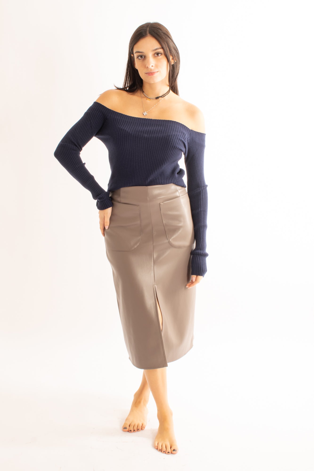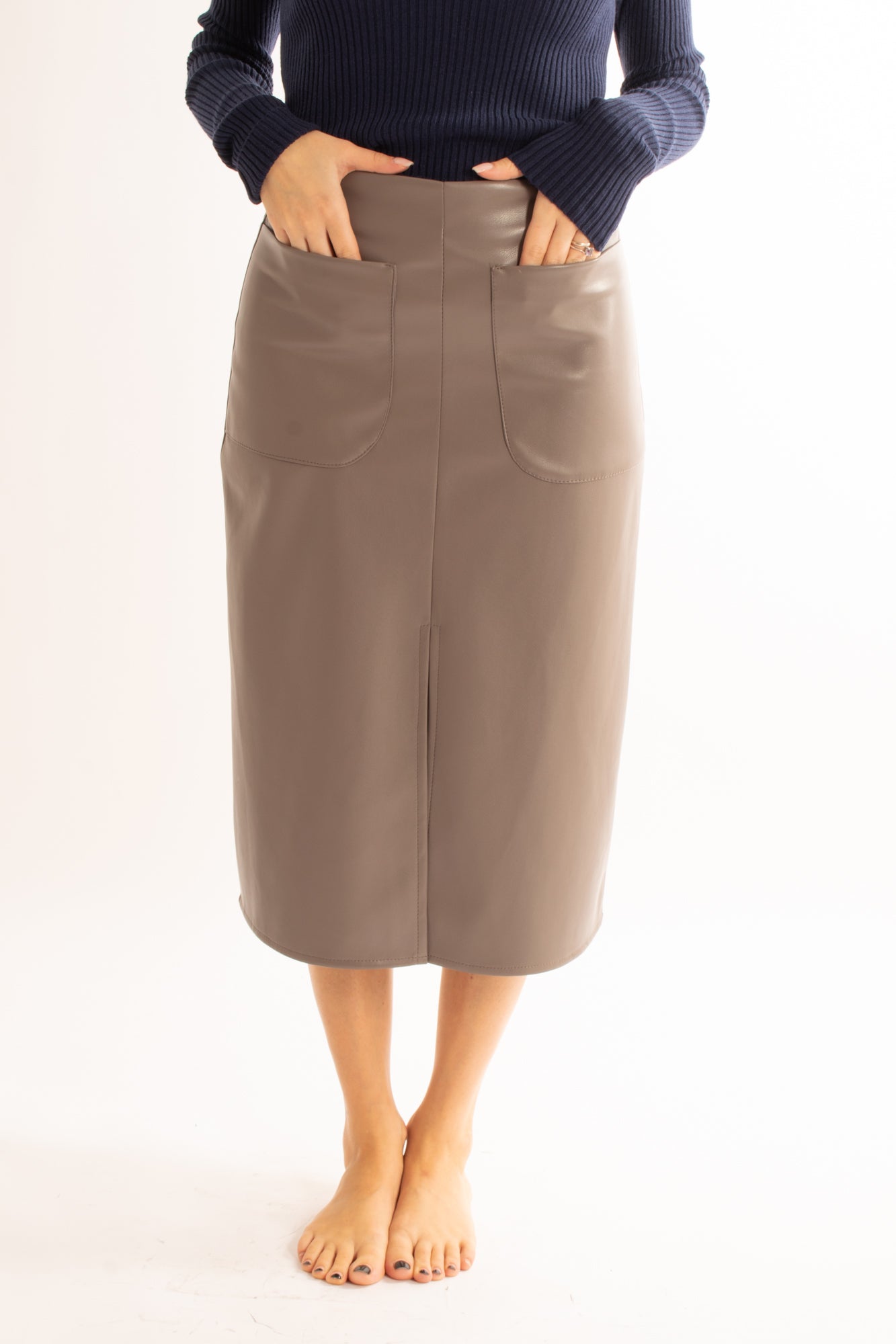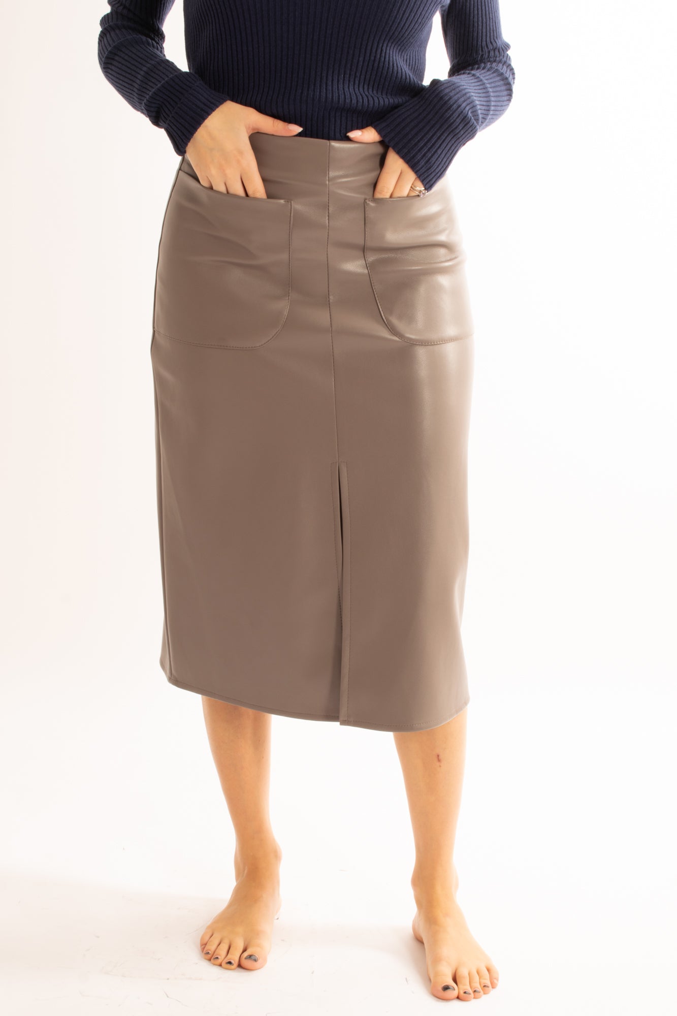 La gonna Gonna è realizzata in robusta eco pelle ed è dotata di tasconi per una finitura chic. Grazie al suo design a 3/4, offre versatilità e comfort per un look di tendenza.