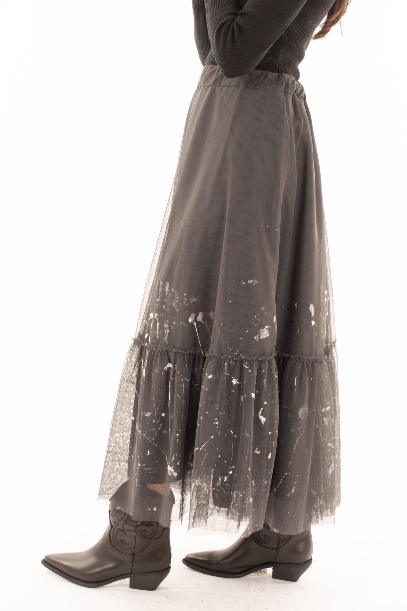 "Esplora l'eleganza creativa con la nostra splendida gonna lunga in tulle con segni di vernice. Questo capo unico e artistico è stato realizzato con cura per offrirti un look che mescola l'arte e la moda in un modo straordinario. I dettagli con vernice aggiungono un tocco di originalità e individualità a questa gonna, rendendola perfetta per occasioni speciali, eventi culturali o semplicemente per esprimere la tua personalità unica attraverso il tuo stile. La gonna è disponibile in diverse taglie , garantendo una vestibilità comoda e adattabile a ogni figura. Scegli la tua gonna lunga in tulle con segni di vernice e preparati a brillare in qualsiasi situazione."