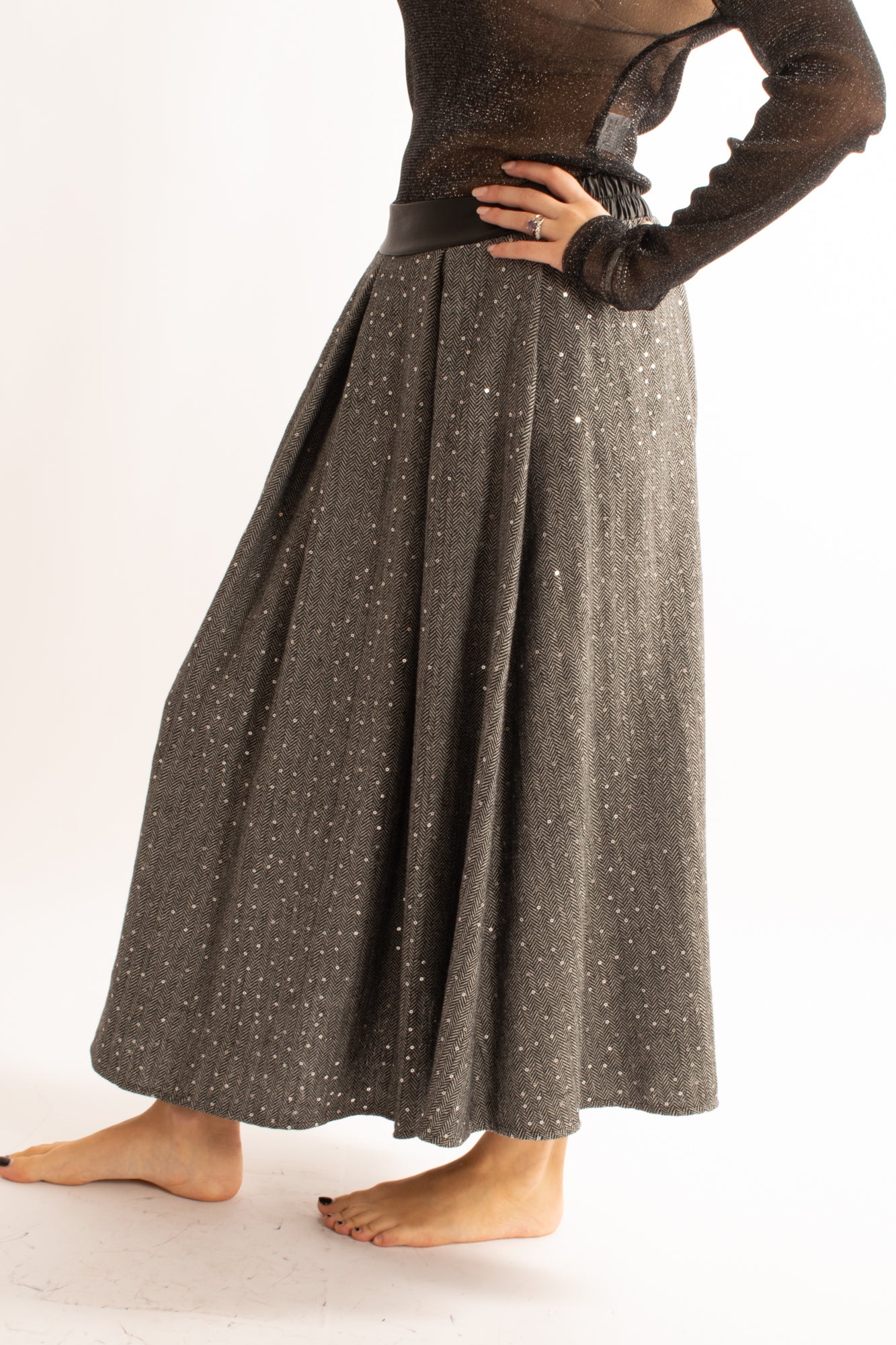 La Gonna offre un dettaglio affascinante con la sua tessitura spinata e paillettes. Questo design lungo renderà ogni outfit luminoso e divertente. Ottima per un look da sera audace e ricercato.