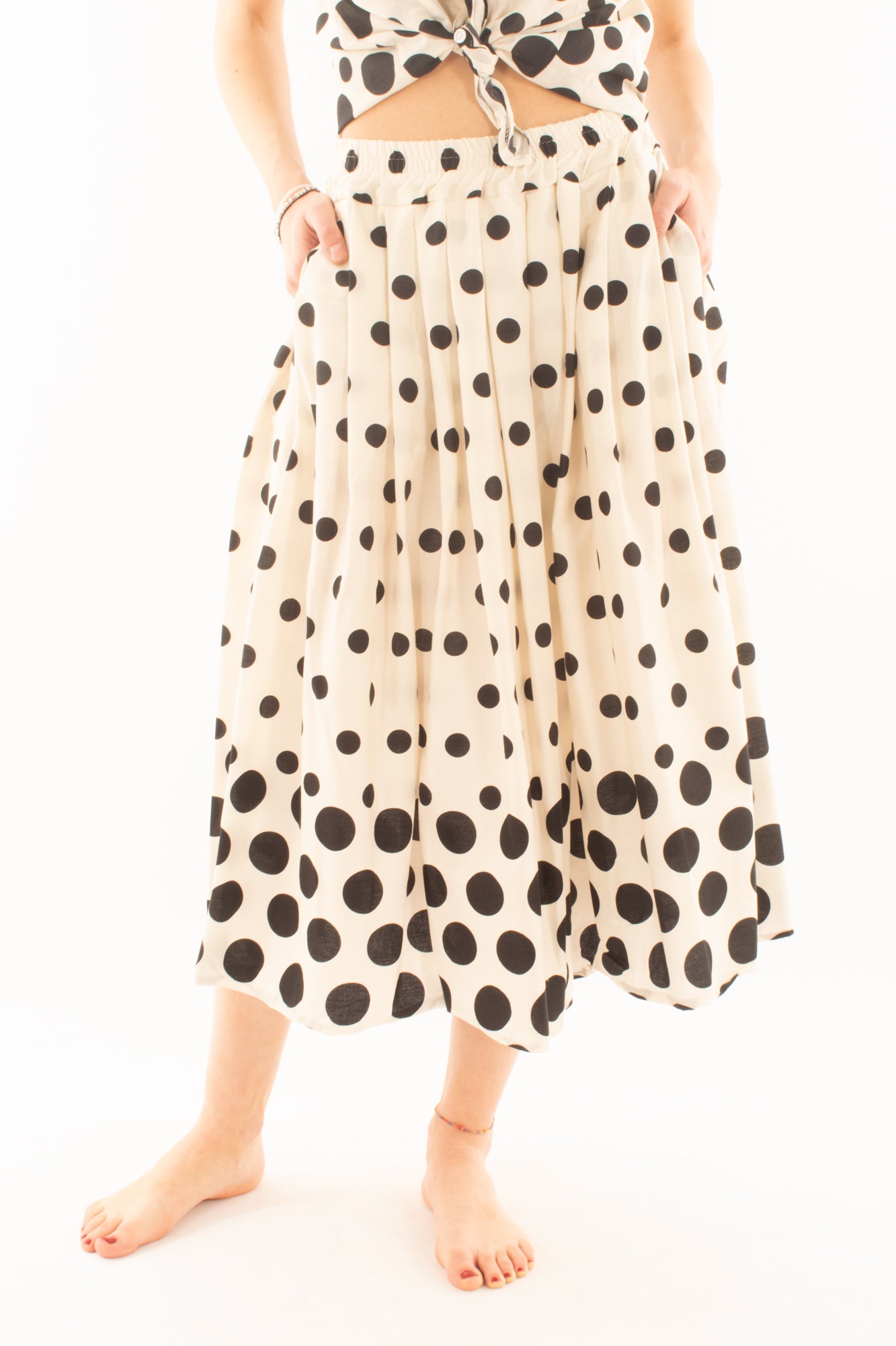 Scopri la grazia senza tempo di una gonna lunga a pois svasata. Perfetta per ogni occasione, questa creazione iconica aggiunge un tocco di eleganza giocosa al tuo guardaroba
