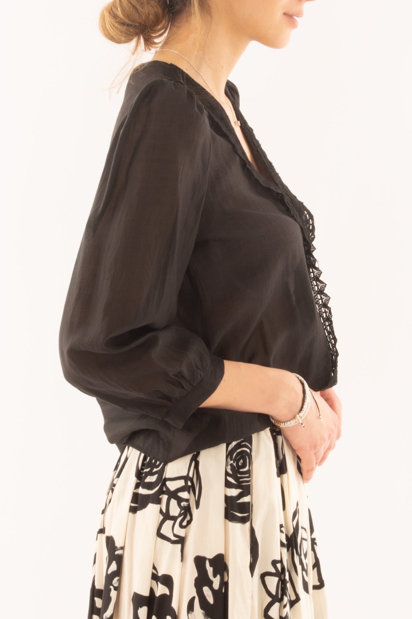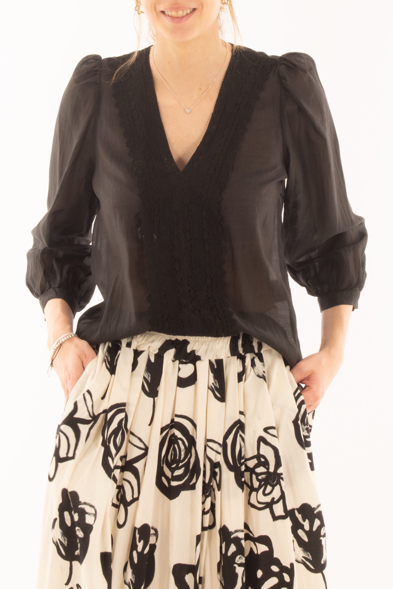 Scopri la nostra elegante maglia a V con profili in pizzo e manica a 3/4. Realizzata con materiali di alta qualità, questa maglia unisce raffinatezza e comfort, perfetta per ogni occasione. Aggiungi un tocco di femminilità e stile al tuo guardaroba con questo capo unico.