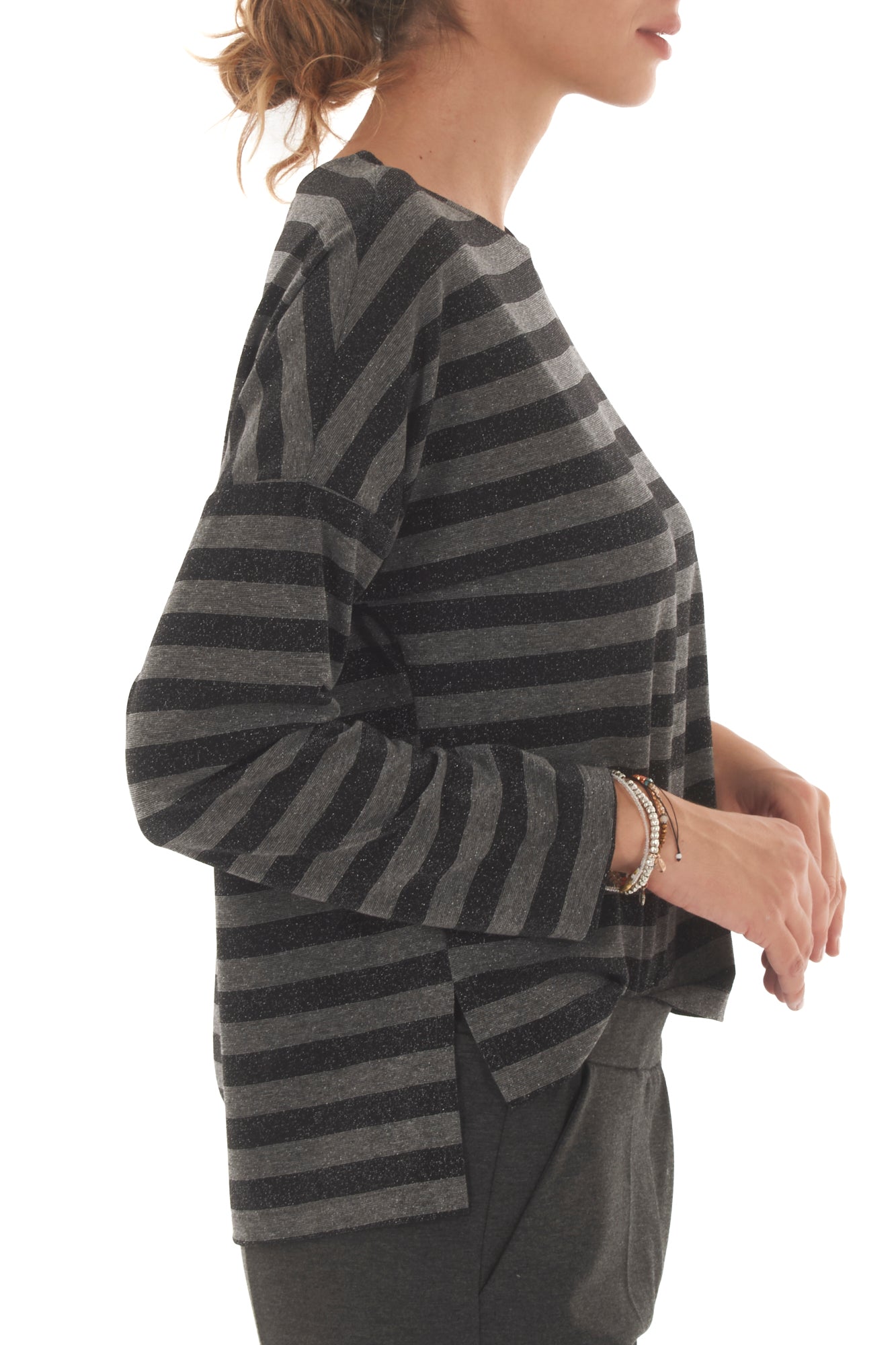 Maglia girocollo rigata con eleganti fili di lurex, dal taglio dritto che valorizza la silhouette. Un capo versatile e moderno, perfetto per aggiungere un tocco di luminosità ai tuoi outfit quotidiani o alle occasioni speciali.