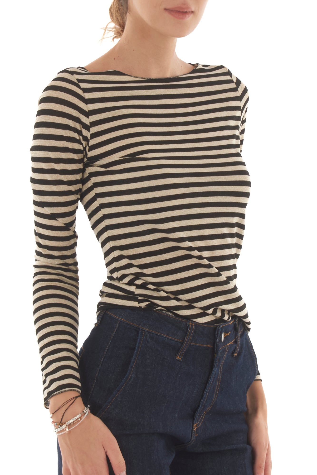 Maglia a righe con collo a barca e manica lunga, arricchita da filato in lurex per un tocco di eleganza. Perfetta per aggiungere un tocco scintillante al tuo look quotidiano, combina comfort e stile con una vestibilità versatile e moderna.