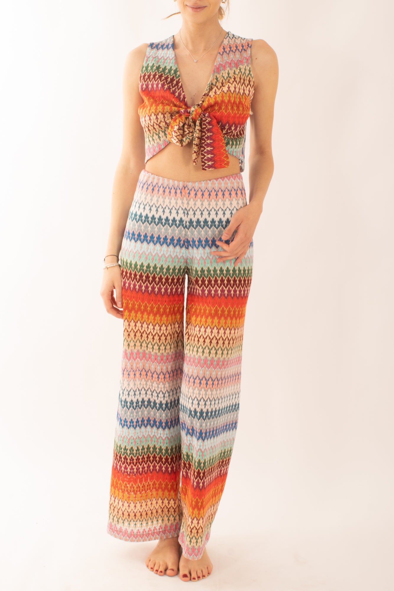 Scopri la nostra maglia corta smanicata con fantasia ispirata a Missoni. Con un elegante nodo frontale, questa maglia unisce stile e comfort, perfetta per un look estivo chic. Realizzata con materiali di alta qualità, aggiunge un tocco di sofisticatezza a ogni outfit.