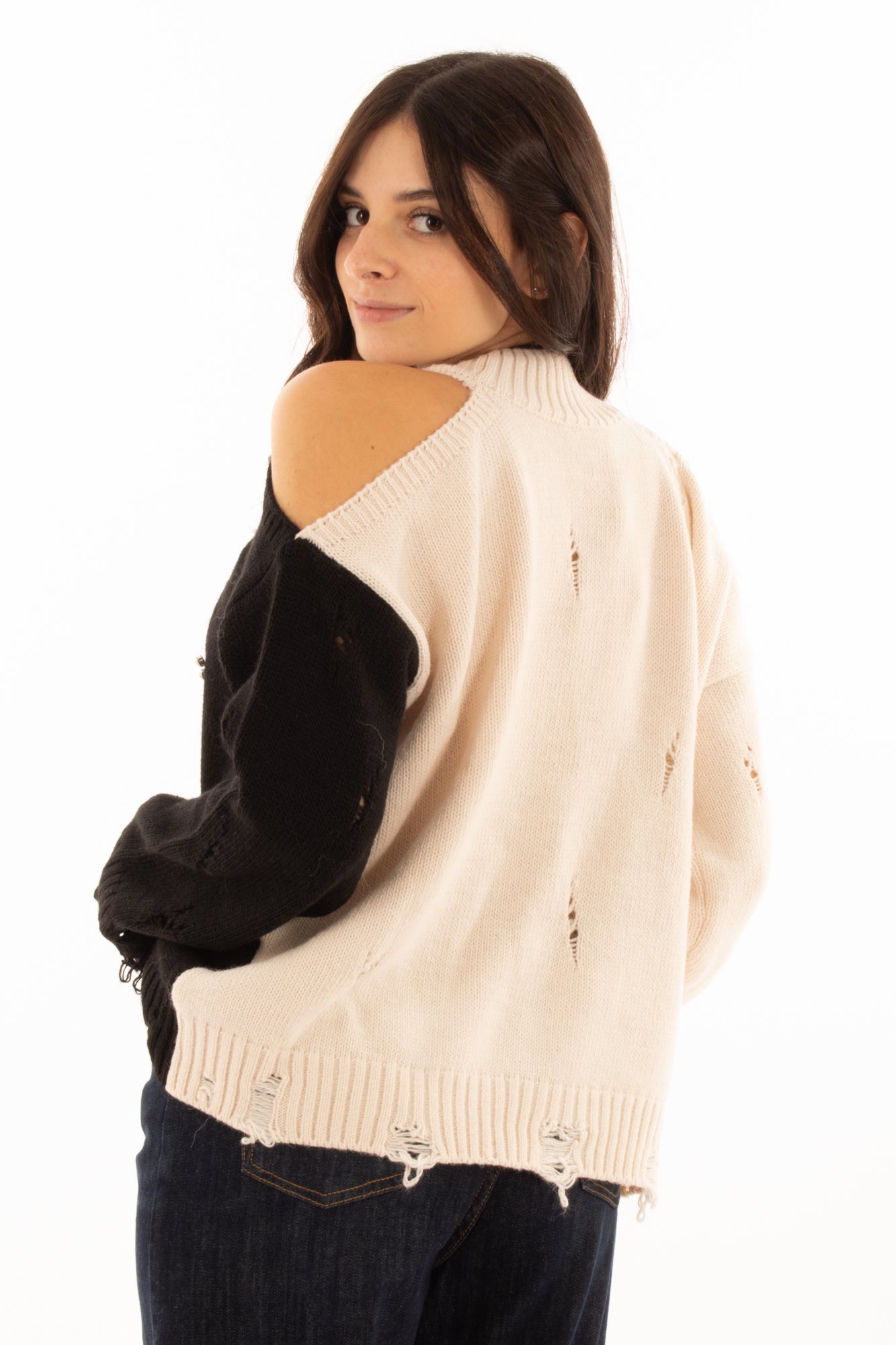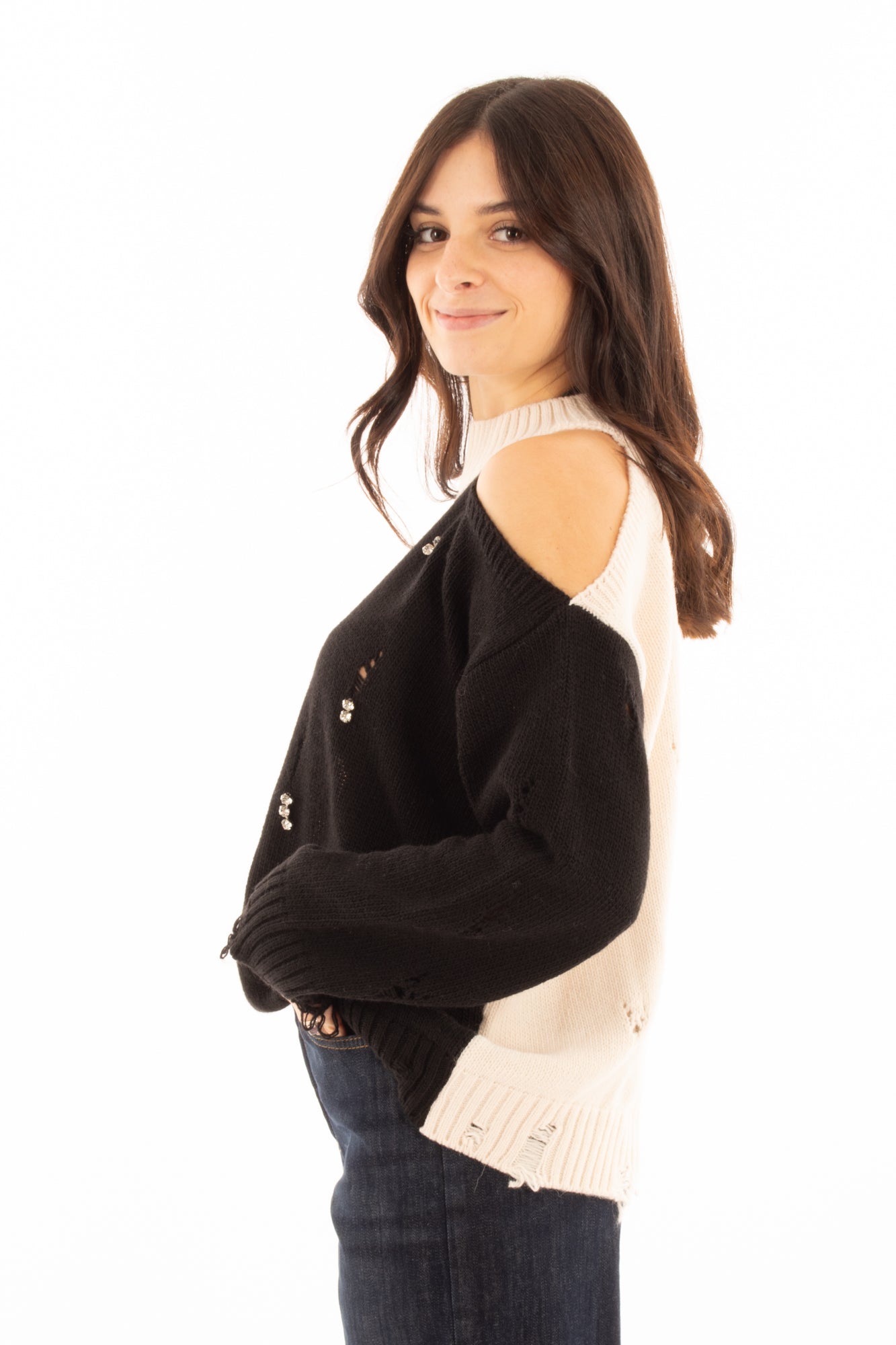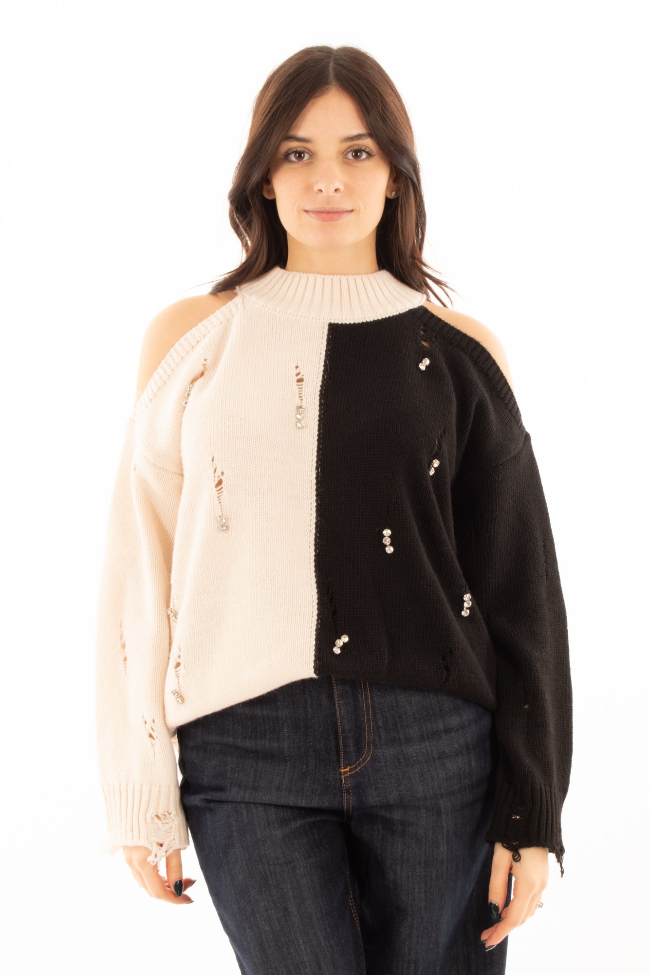 "Esalta il tuo stile con il nostro maglione bicolore esclusivo! Con dettagli raffinati di pietre e fori sfilacciati, questo capo unico aggiunge un tocco di eleganza e audacia al tuo guardaroba invernale. Realizzato con cura e attenzione ai dettagli, questo maglione ti offre un look alla moda e comodo. Scopri la bellezza della moda con il contrasto cromatico e la texture intrigante di questo capo, perfetto per creare outfit distintivi. Rendi la tua stagione ancora più speciale con il nostro maglione che unisce stile e comfort in modo straordinario."
