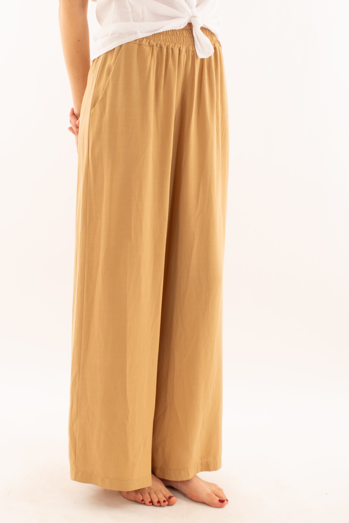 Pantalone a palazzo in viscosa e lino con elastico in vita: il massimo del comfort e dello stile. Leggero, traspirante e perfetto per ogni occasione, offre un look elegante e raffinato mantenendo una sensazione di freschezza e libertà. Adatto per outfit casual e formali