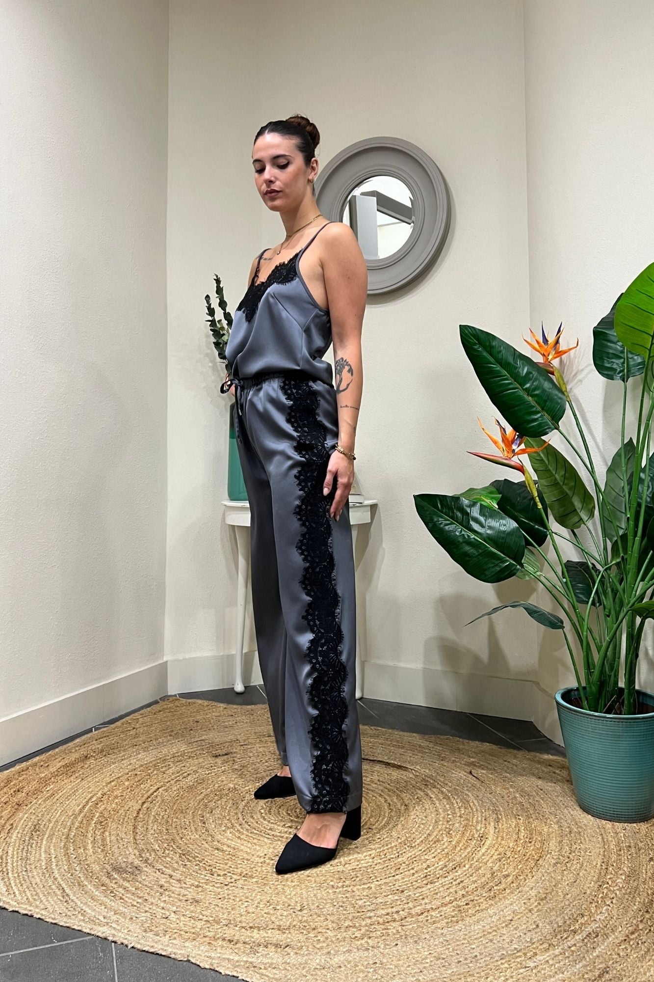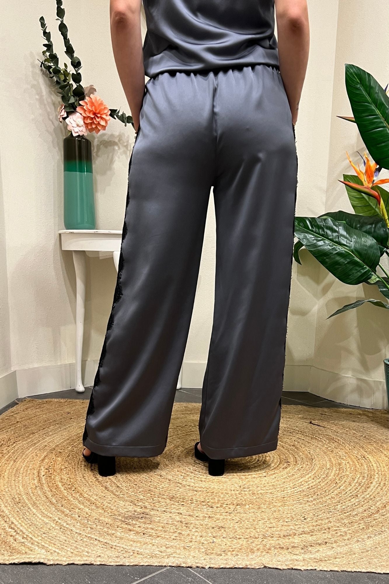 Pantalone in satin: un capo che unisce eleganza e comfort. La banda in pizzo laterale aggiunge un tocco di raffinatezza e unicità. Ideale per serate speciali, per un look chic e distintivo.