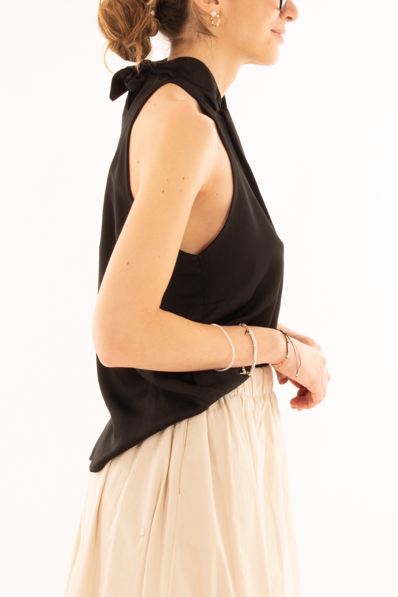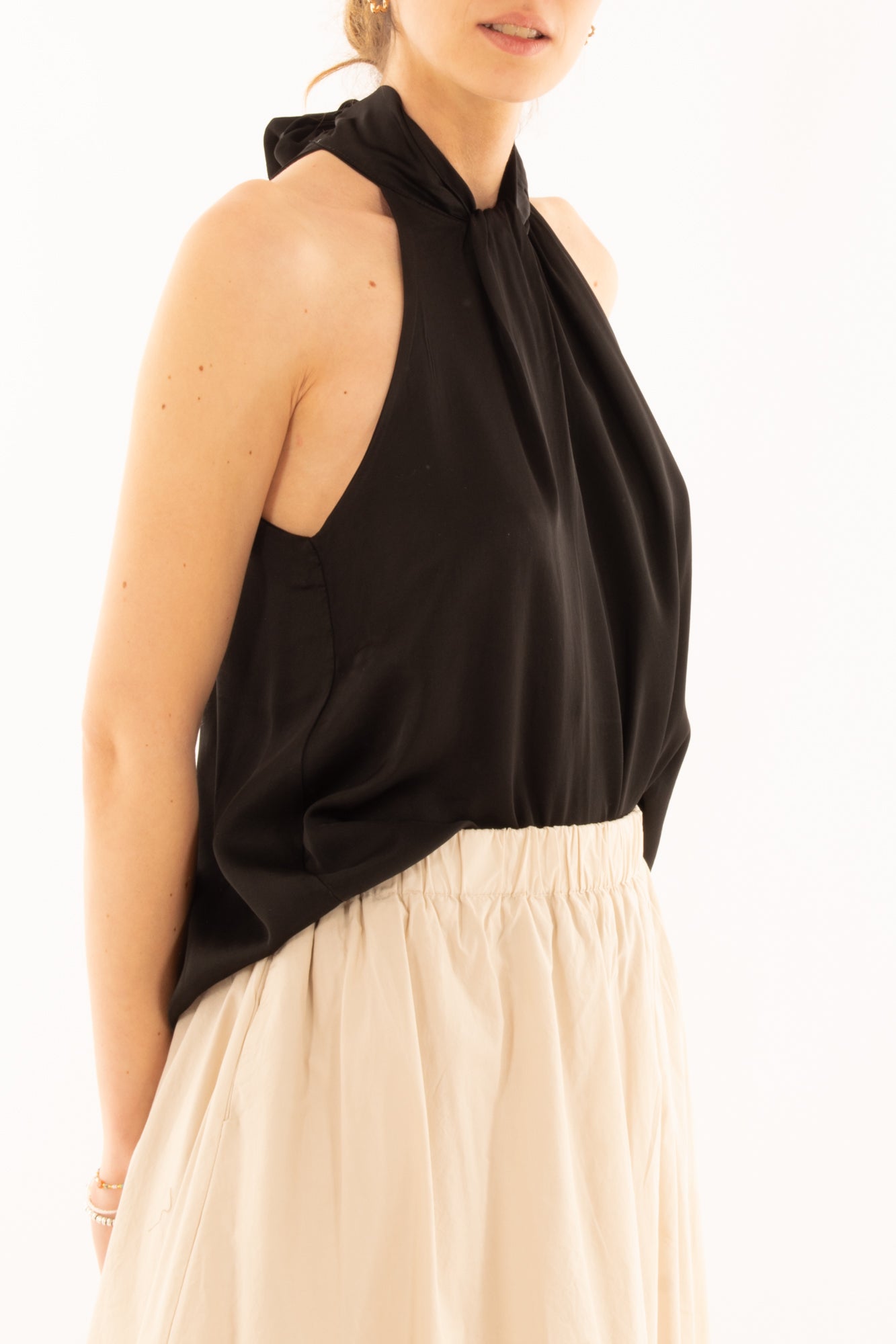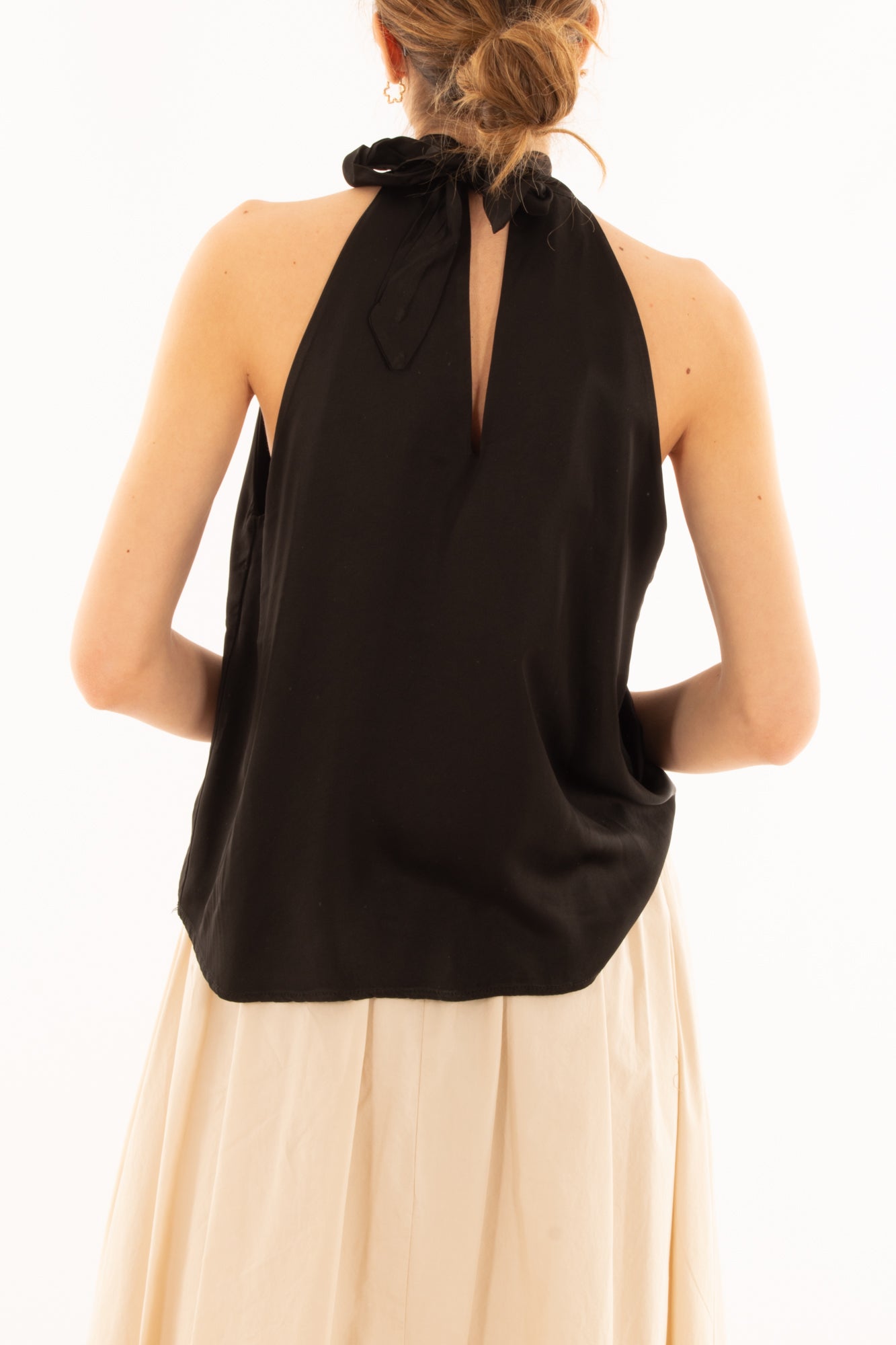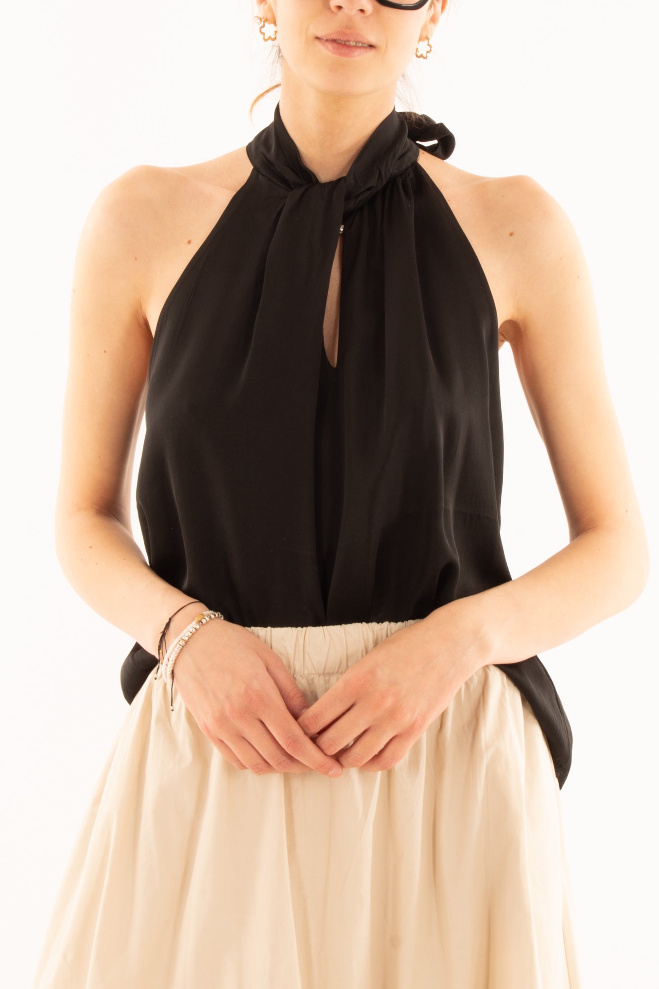 Elegante maglia smanicata in viscosa con allacciatura al collo e raffinata goccia sul davanti e sul retro. Perfetta per un look sofisticato e moderno, ideale per serate estive o occasioni speciali. Comfort e stile si incontrano in un capo versatile e chic.