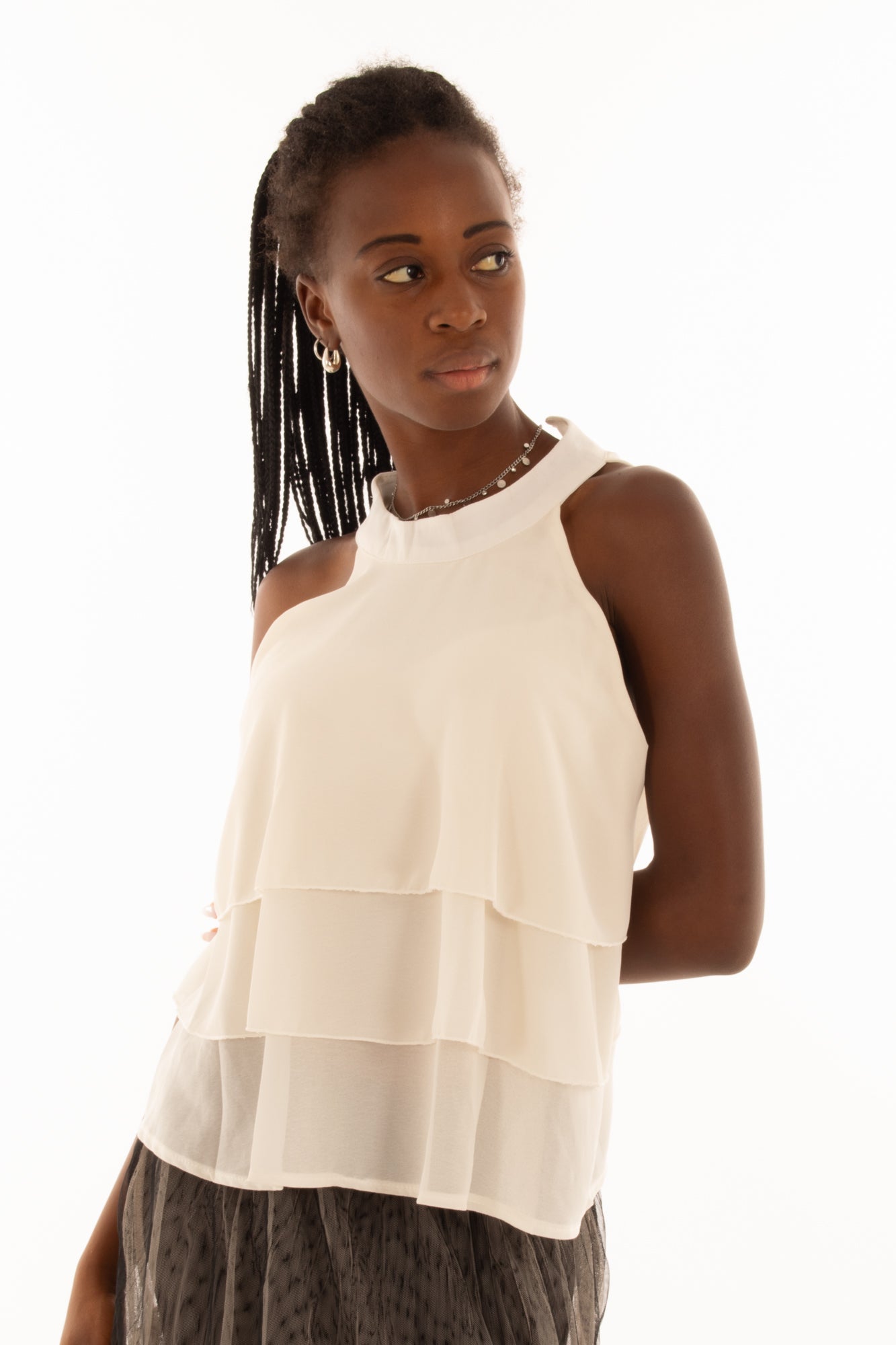 La maglia è un design moderno smanicato a lupetto e balze, che fornisce un comfort eccellente e offre un look elegante. La sua forma leggera consente di indossarlo per tutto il giorno.