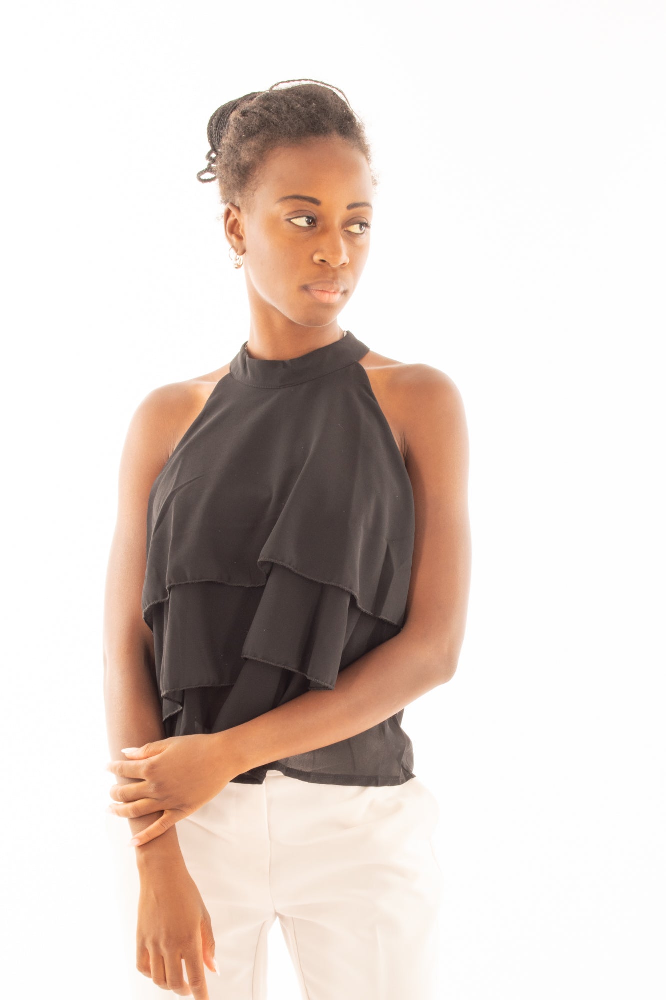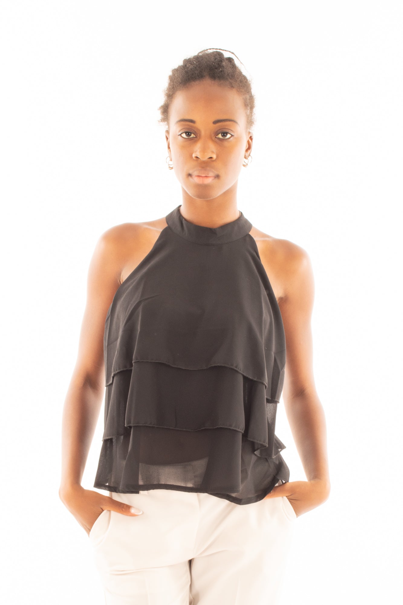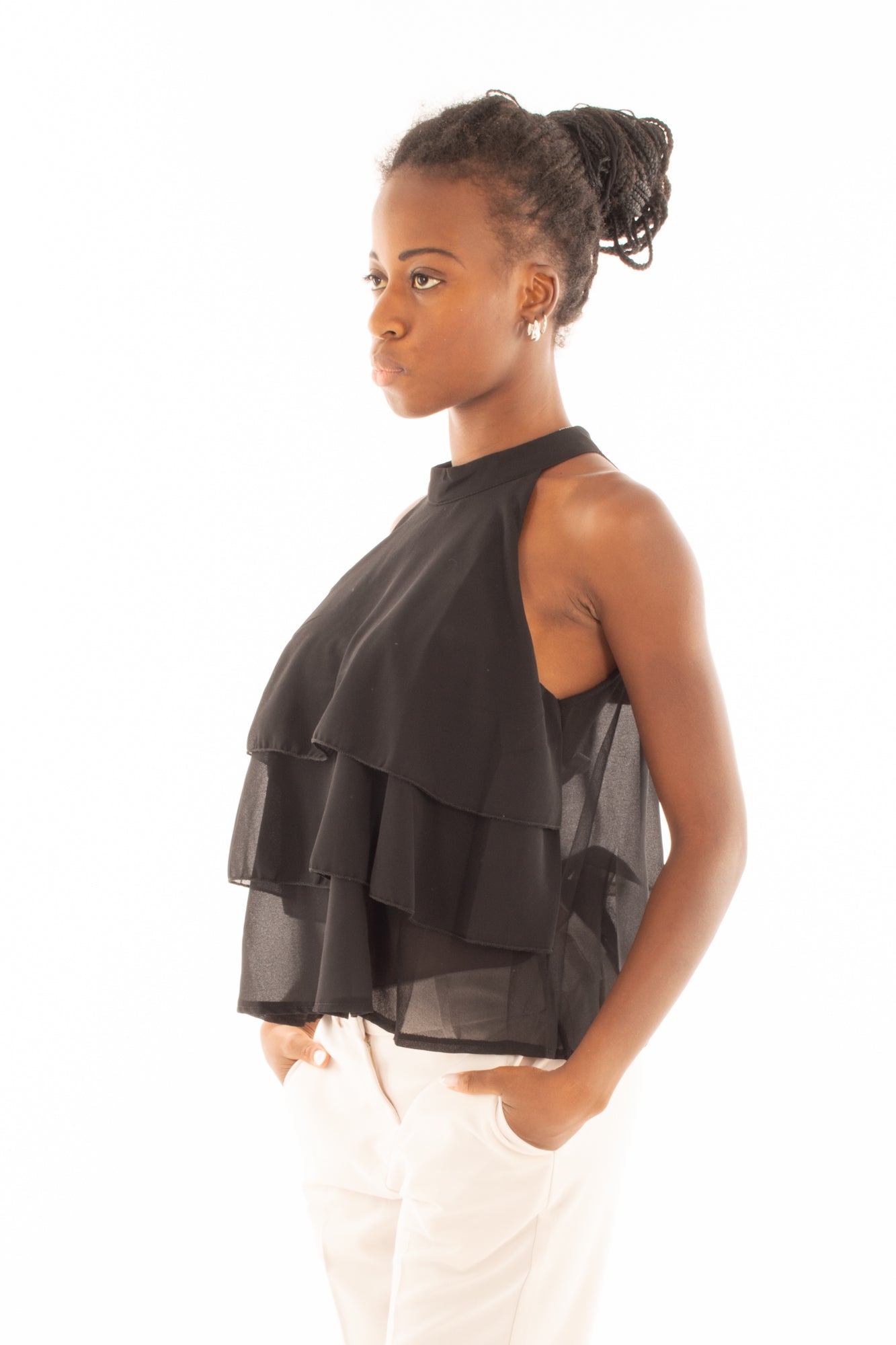 La maglia è un design moderno smanicato a lupetto e balze, che fornisce un comfort eccellente e offre un look elegante. La sua forma leggera consente di indossarlo per tutto il giorno.