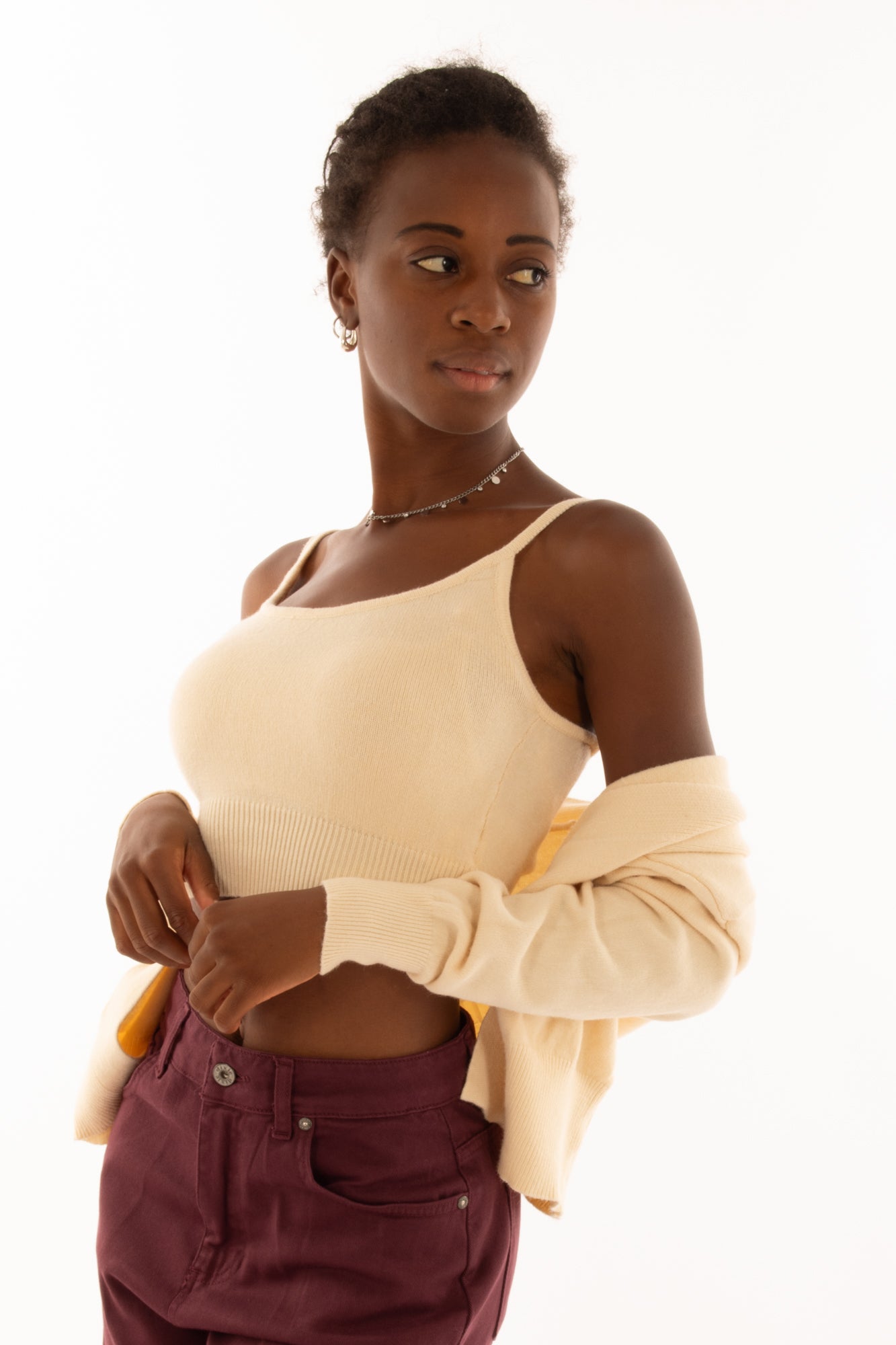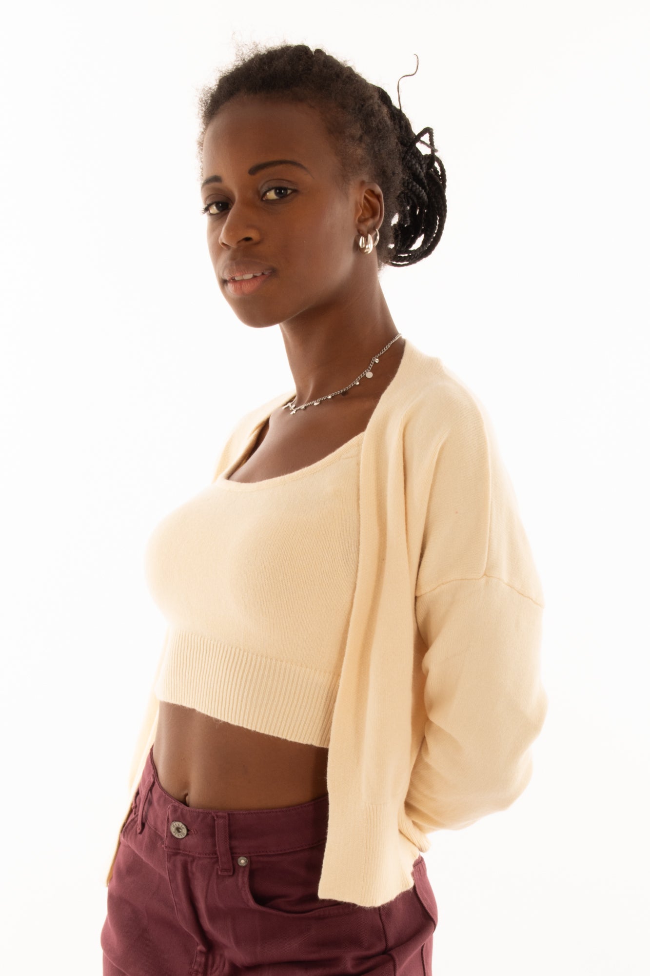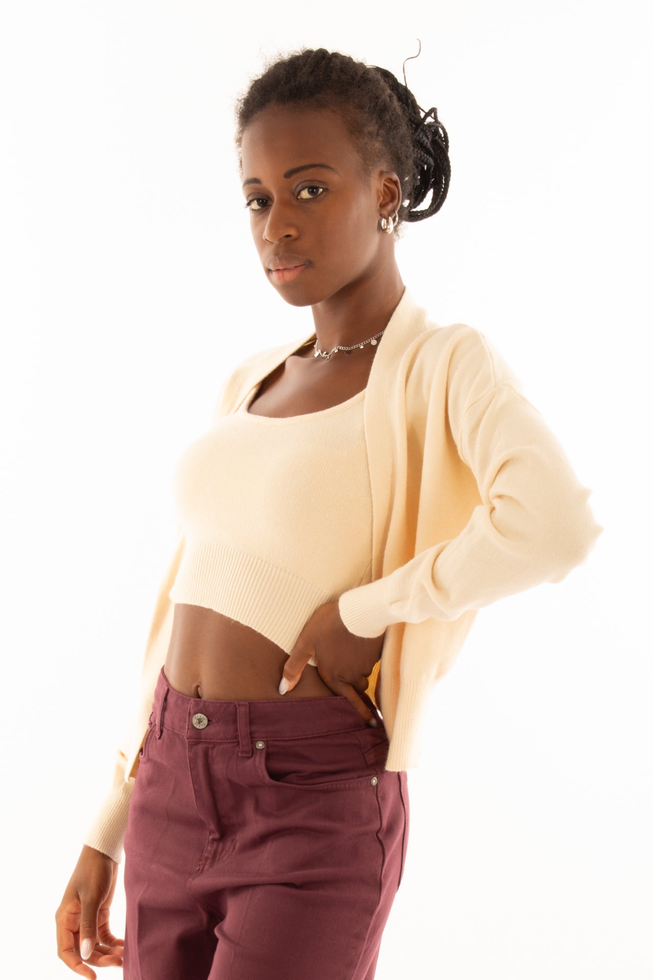 Goditi gli abbinamenti senza sforzo del twinset, composto da canottiera corta e cardigan aperto. La praticità di questo look si unisce allo stile unico per creare un outfit strepitoso con pochissimi sforzi.