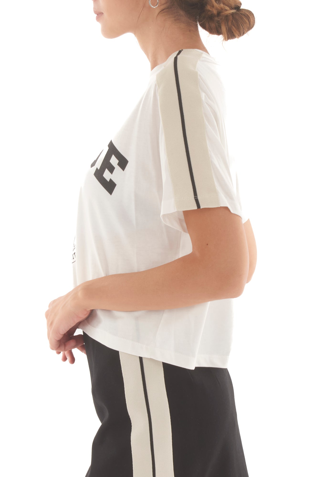 T-shirt a mezza manica dallo stile casual con scritte in stile college sul petto e bande sulle maniche. Perfetta per un look sportivo e di tendenza, ideale per abbinamenti urban e streetwear. Tessuto confortevole e design unico per un outfit dinamico e alla moda.