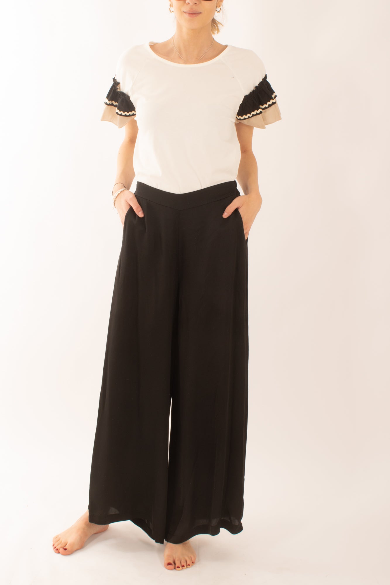 Elegante e versatile, questa t-shirt presenta un design unico con balze doppie a contrasto. Realizzata in tessuti di alta qualità, offre comfort e stile per ogni occasione. Perfetta per aggiungere un tocco chic al tuo guardaroba, abbinandosi facilmente a vari outfit casual o eleganti.