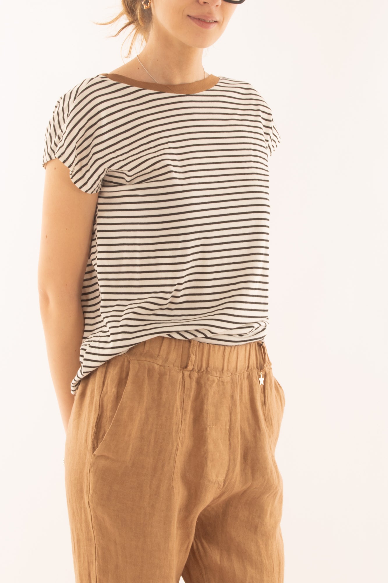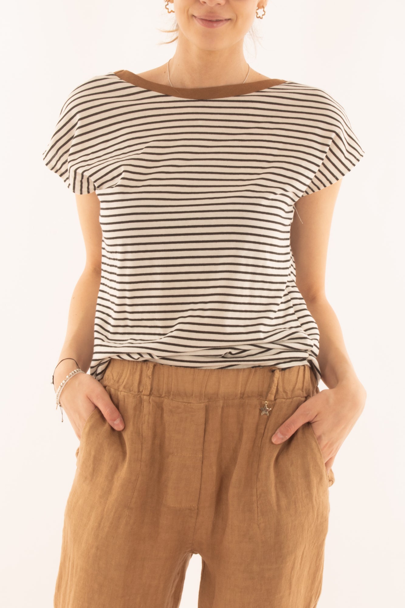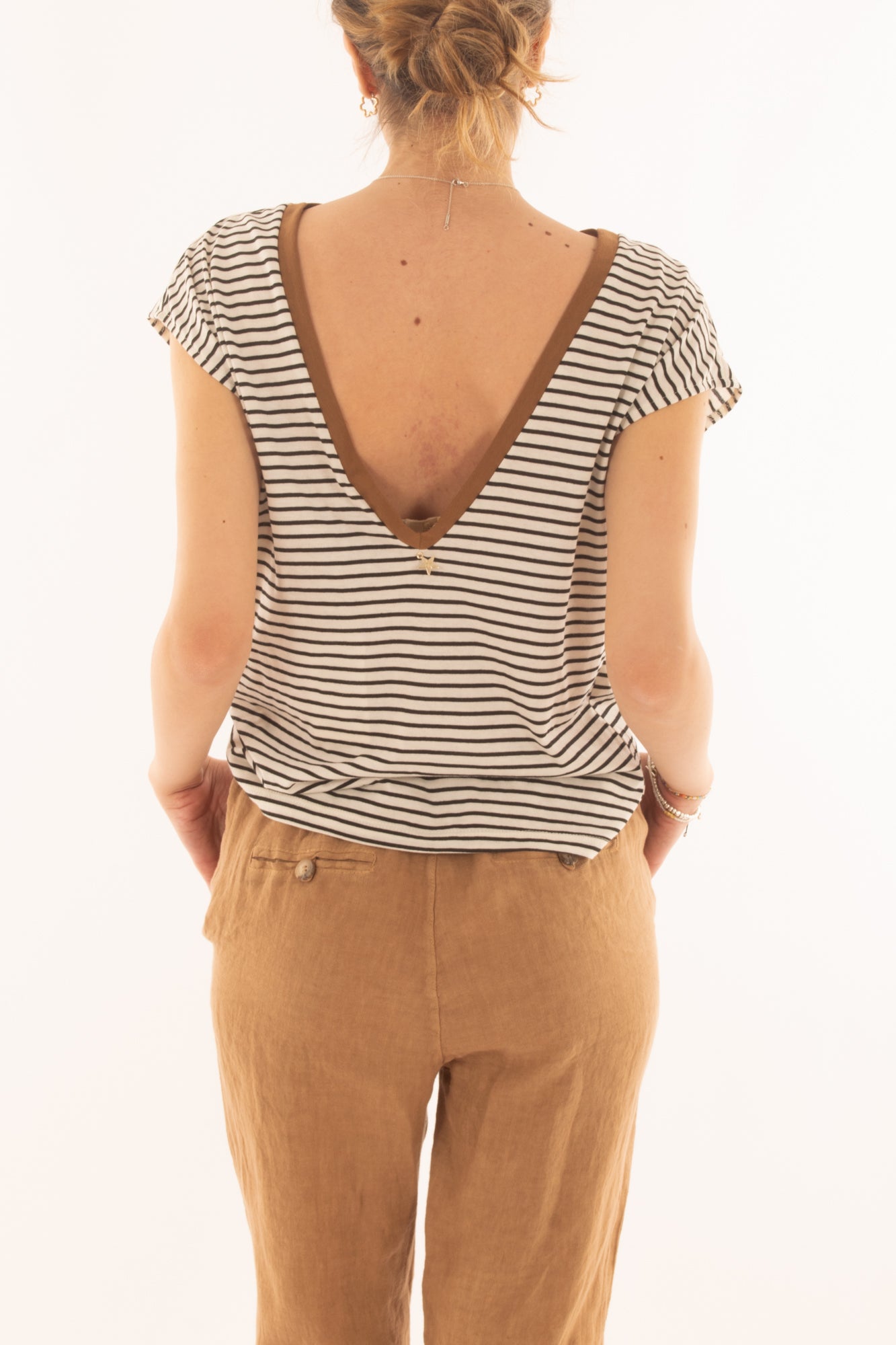 Mostra il tuo stile con una t-shirt rigata dal design audace: schiena scoperta e profili contrastanti per un look unico ed elegante. Perfetta per ogni occasione estiva.