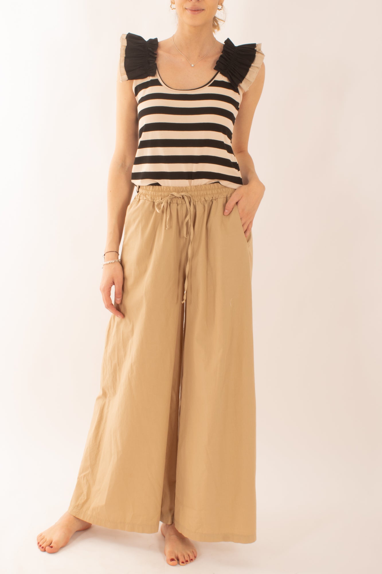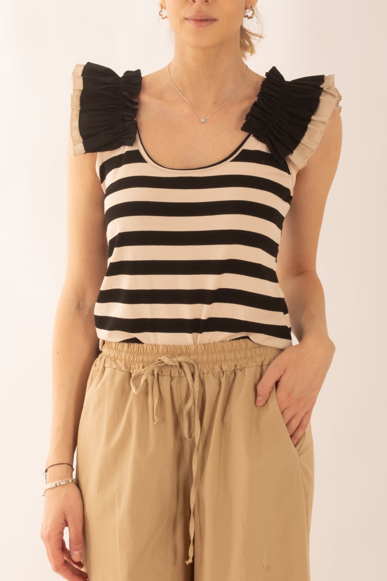 T-shirt rigata con eleganti balze doppie a contrasto. Realizzata in tessuto di alta qualità, offre comfort e stile unici. Perfetta per aggiungere un tocco chic al tuo guardaroba quotidiano. Ideale per look casual o più sofisticati.