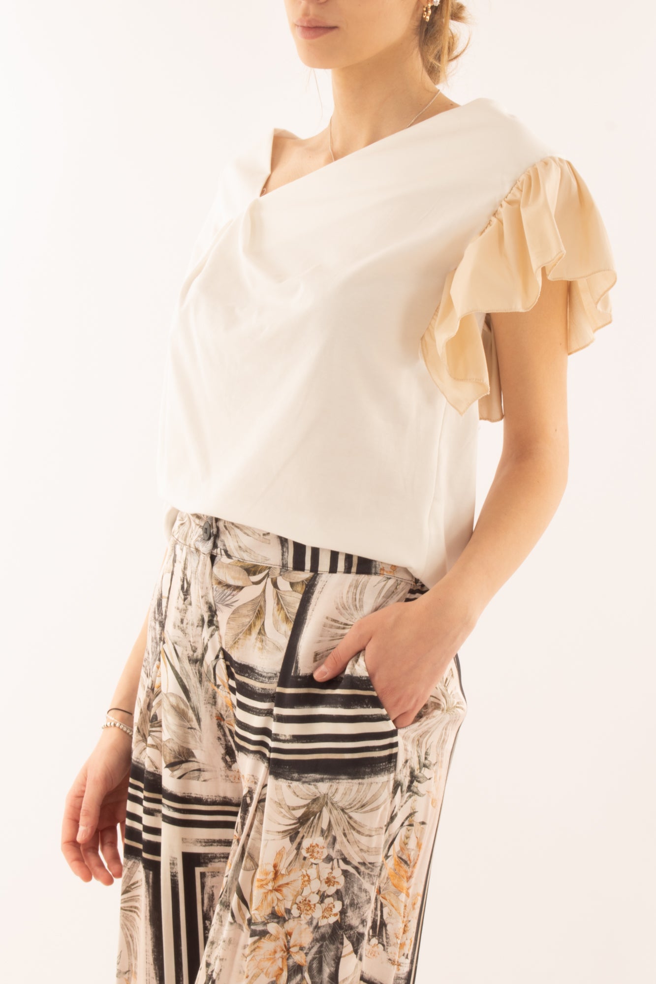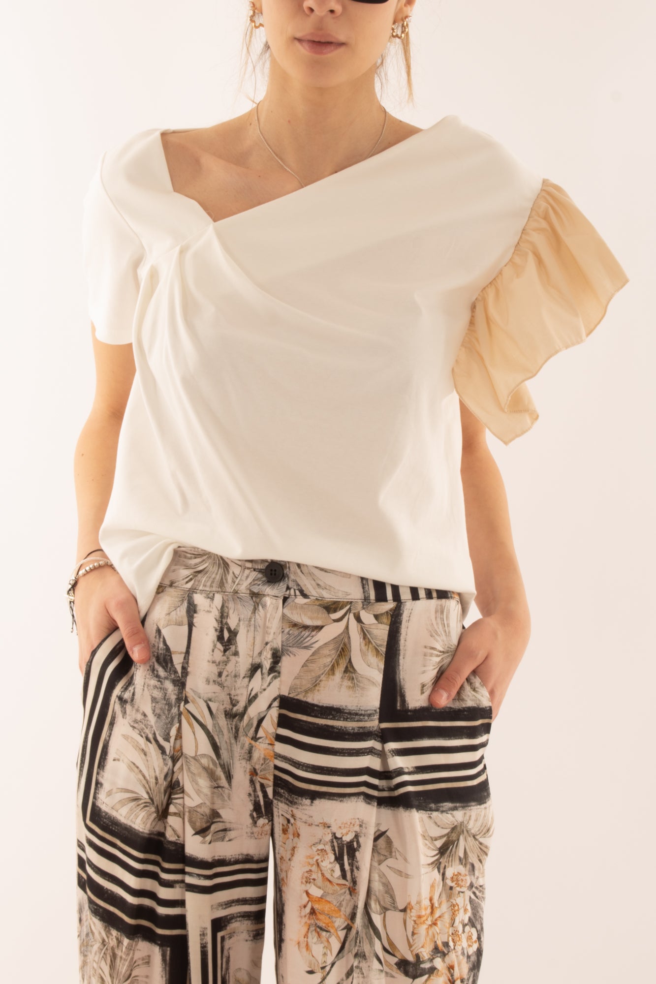 "Scopri l'essenza dell'eleganza moderna con la nostra t-shirt asimmetrica. Balze che aggiungono movimento e stile, tessuto di alta qualità per un comfort senza paragoni. Scegli l'unicità per il tuo look!"
