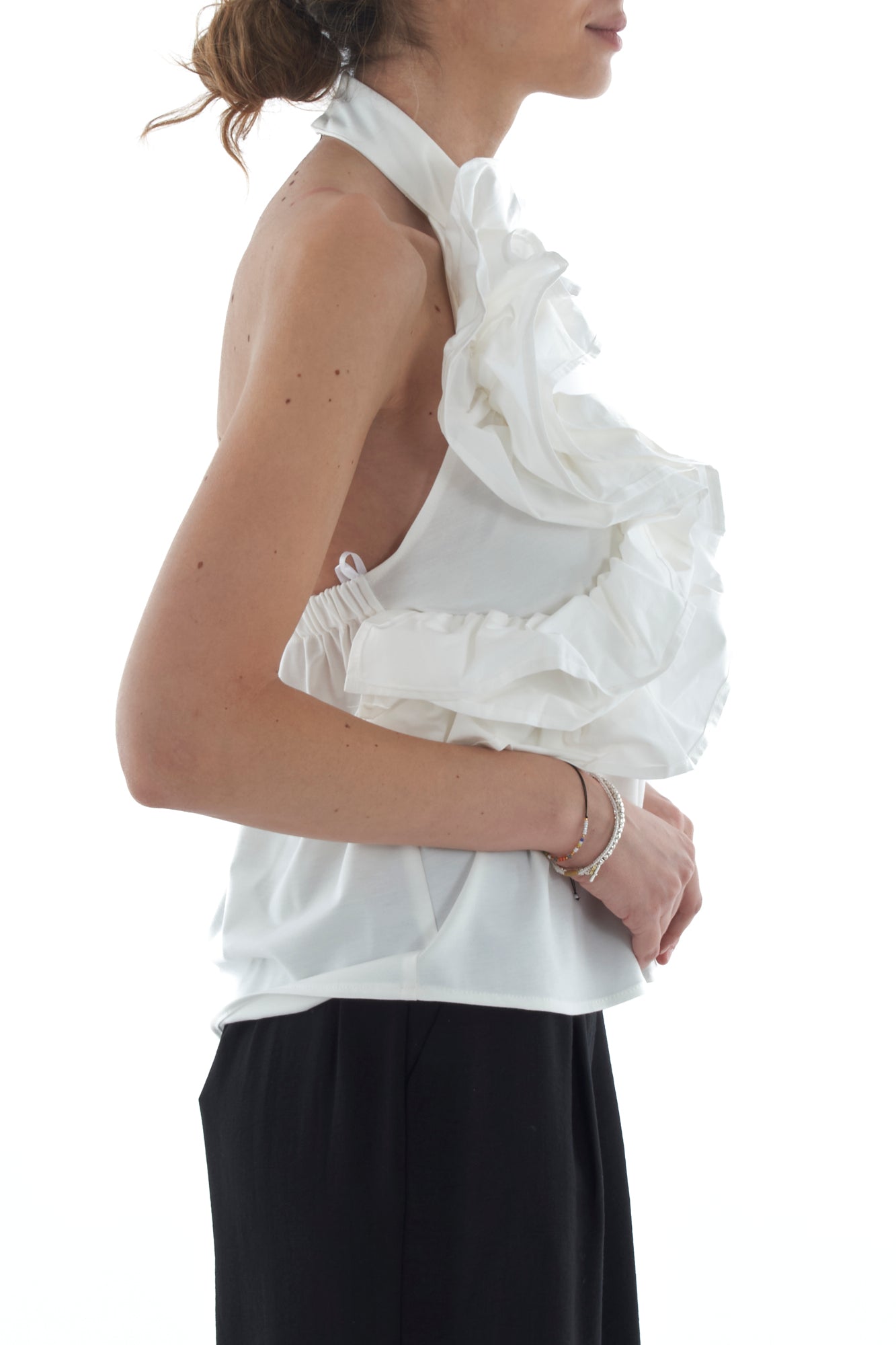 "Esplora il nostro elegante top femminile con design allacciato al collo e schiena scoperta. Perfetto per ogni occasione, questo capo aggiunge un tocco di classe e comfort al tuo guardaroba estivo."