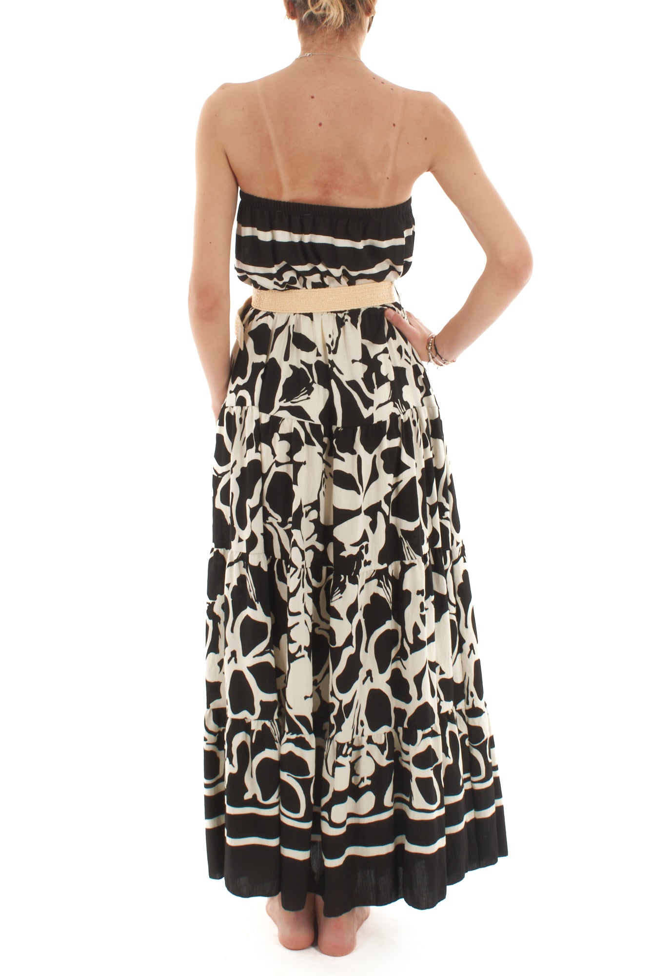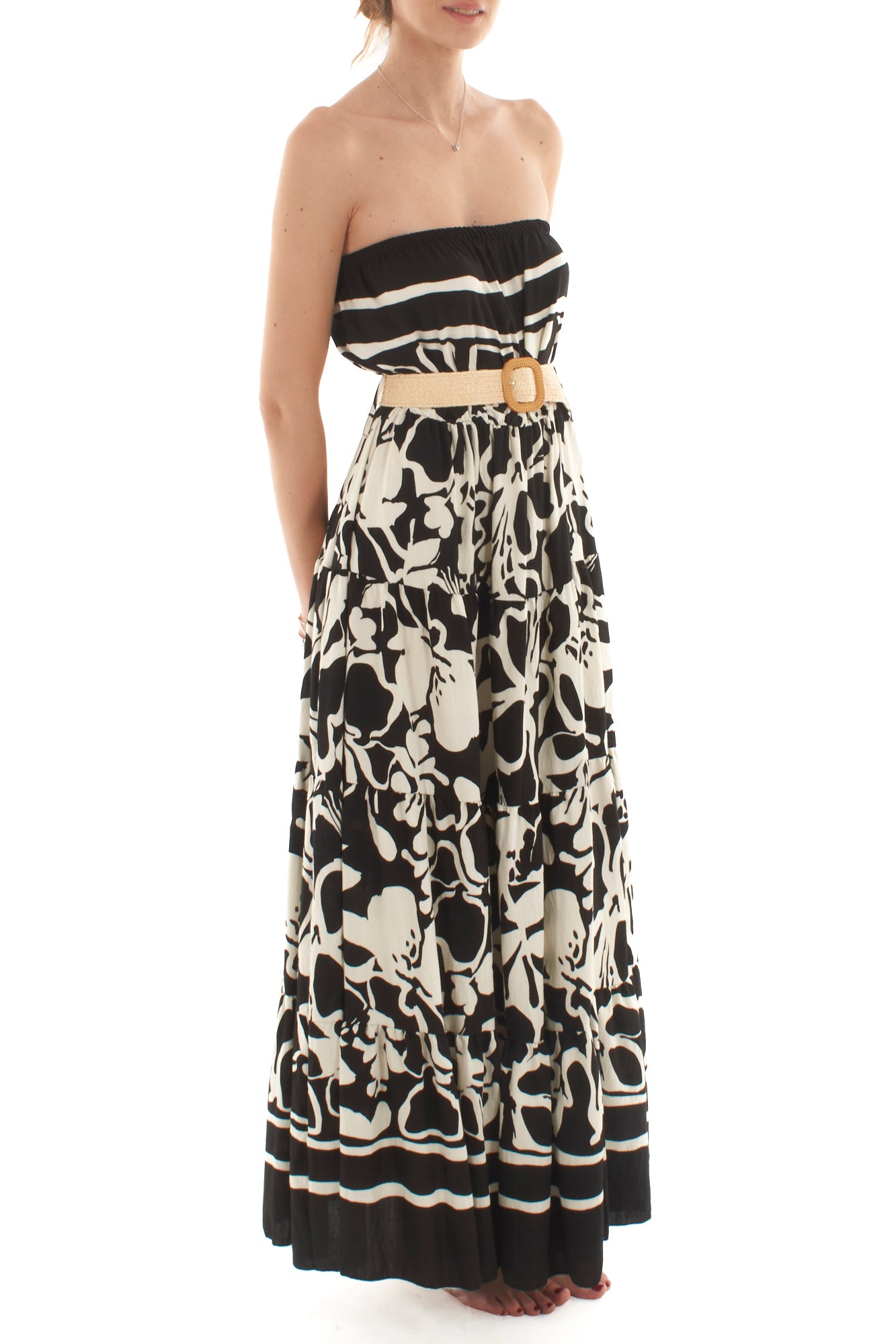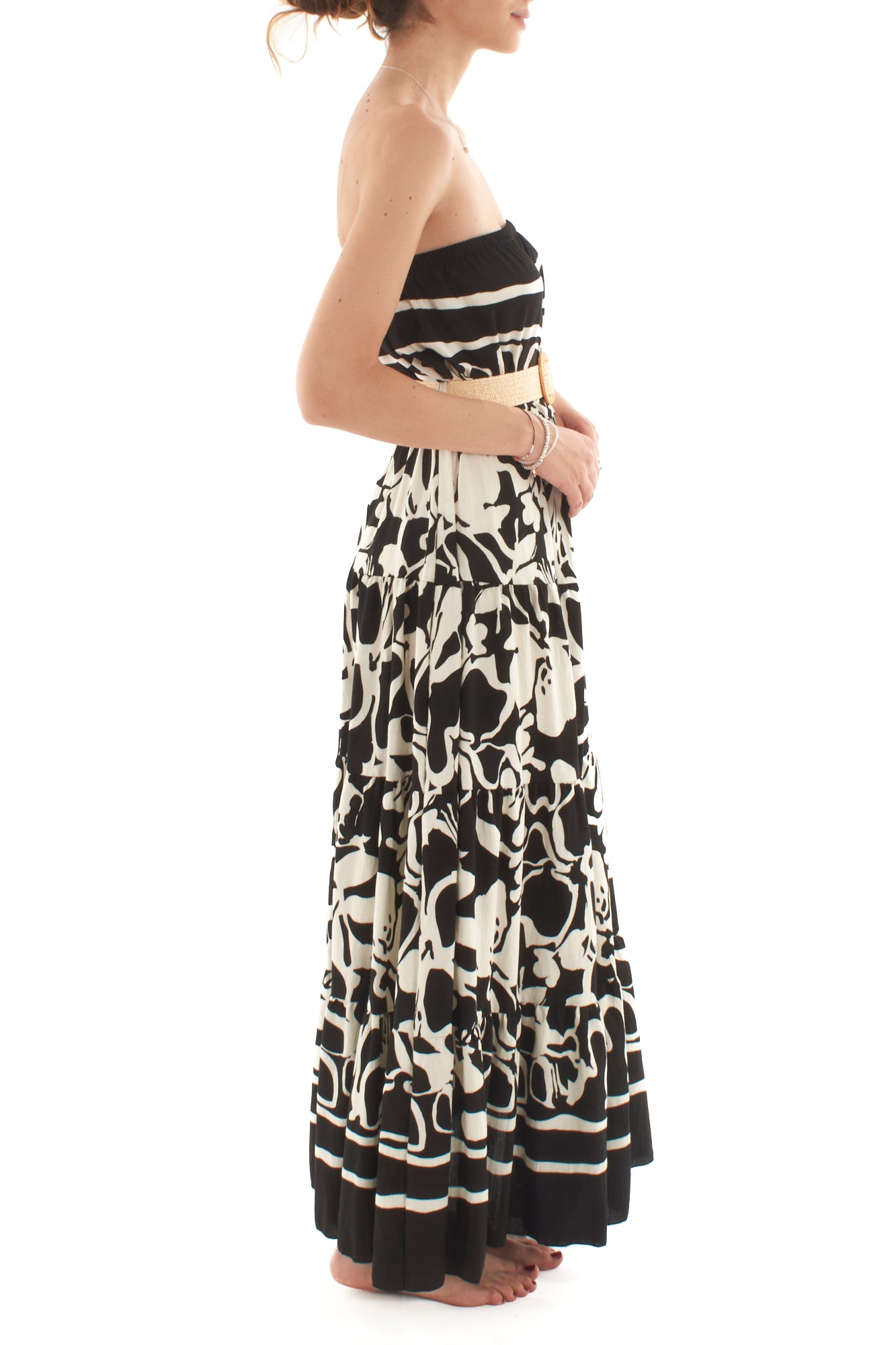 Abito lungo a fascia a fantasia, ideale per ogni occasione. Realizzato con tessuti di alta qualità, garantisce comfort e stile. La sua vestibilità fluida e il design elegante esaltano la silhouette femminile, rendendolo perfetto per eventi speciali e serate estive.